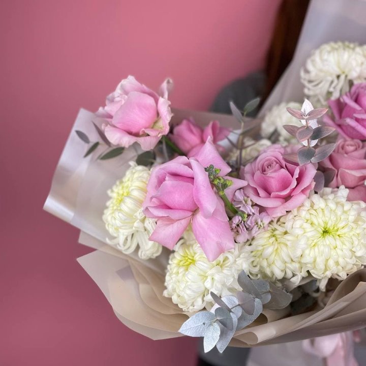 Букет хризантем и роз вайт шотс