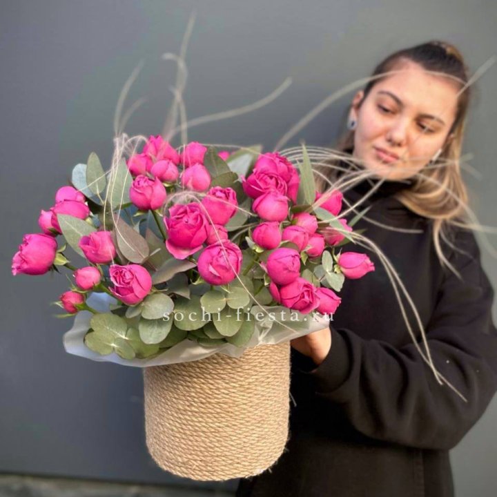 Пионовидные розы Мисти Бабблс в джутовом кашпо
