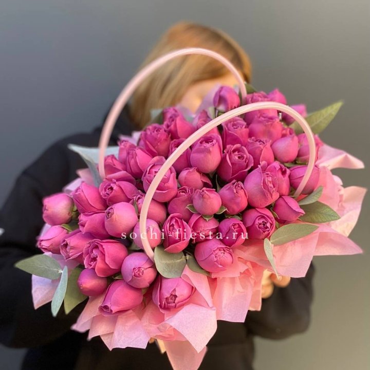 65 пионовидных кустовых роз в корзине