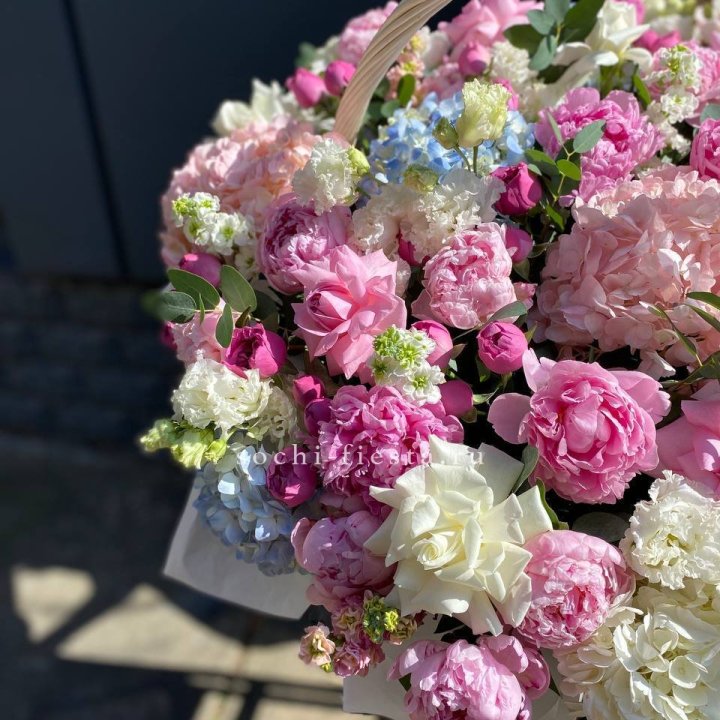 Цветочная корзина из пионов и пионовидных роз "Перфекте"