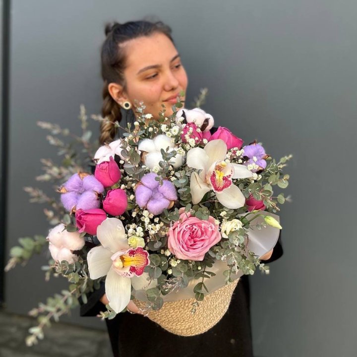 Орхидея и розы в джутовом кашпо