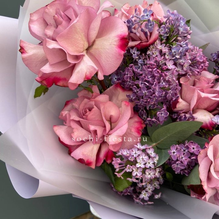 Букет из розовых роз и сирени