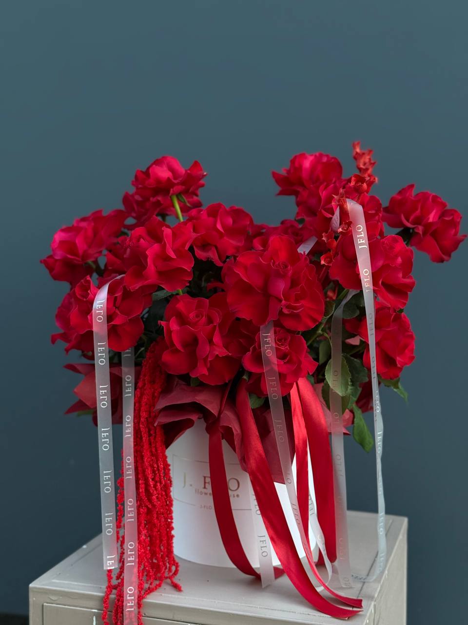 Двадцать одна роза глубокого красного оттенка собрана в плотную композицию с бордовым амарантом и натуральными сухоцветами. Насыщенность цвета создает выразительный образ, а округлая коробка сохраняет форму и свежесть бутонов надолго.