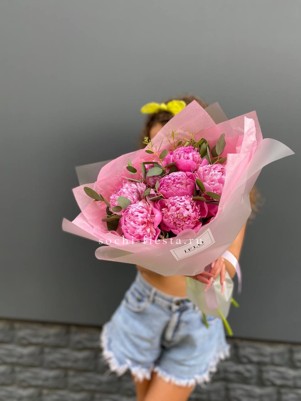 Состав: 7 пионы, эвкалипт, тишью, пленка, лента.