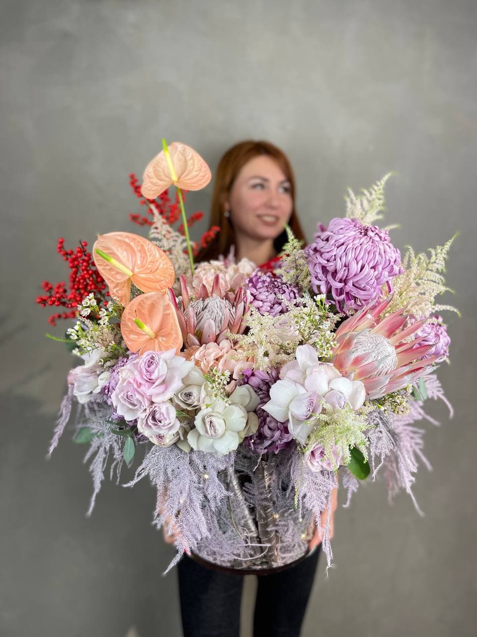 Состав: гортензия, протея, антуриумы, илекс, хамелациум, пионовидные кустовые розы, аспарагус, эвкалипт, астильба (или аналог), илекс, хризантемы (или аналог), декоративная зелень, цилиндр