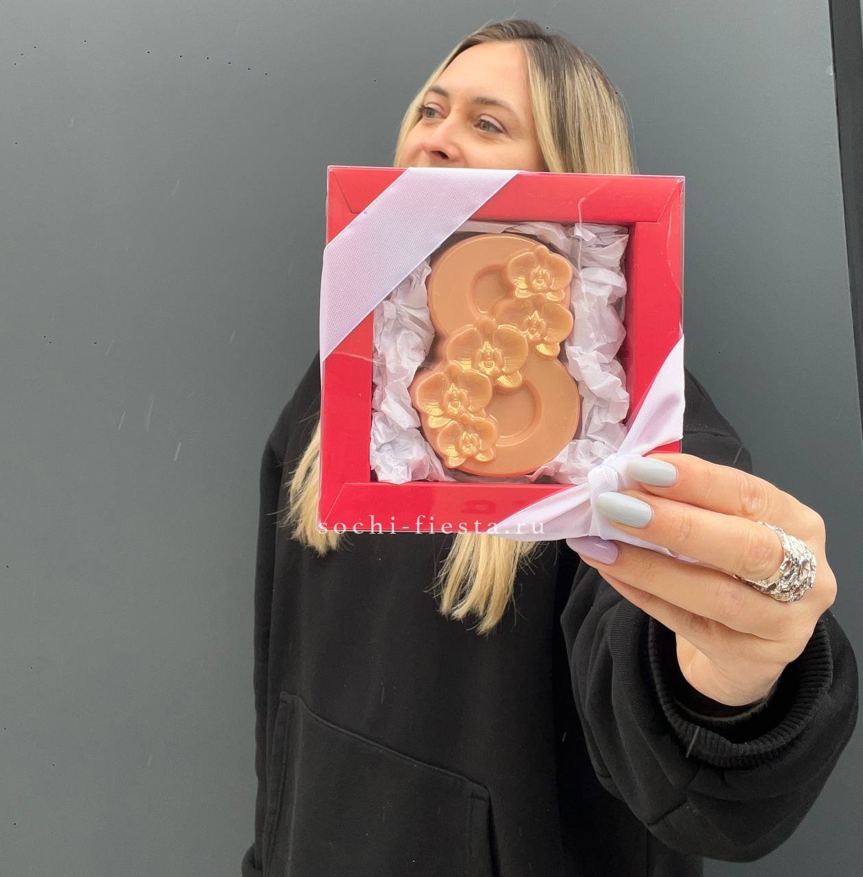 Состав: цифра 8 из бельгийского шоколада (белый шоколад: сахар, масло какао, сухое цельное молоко, соевый лецитин, натуральный амортизатор Ваниль)