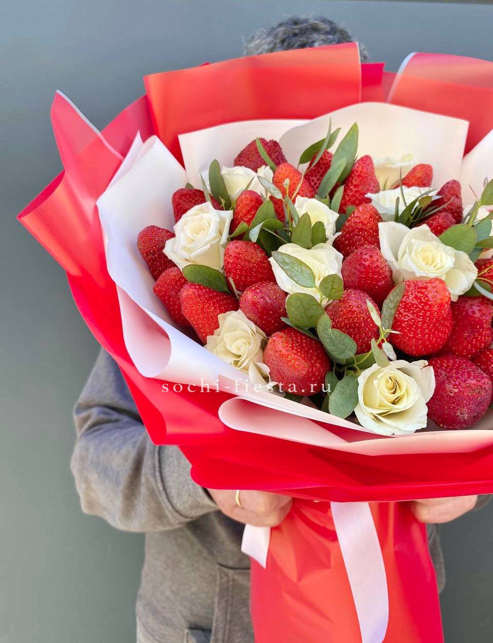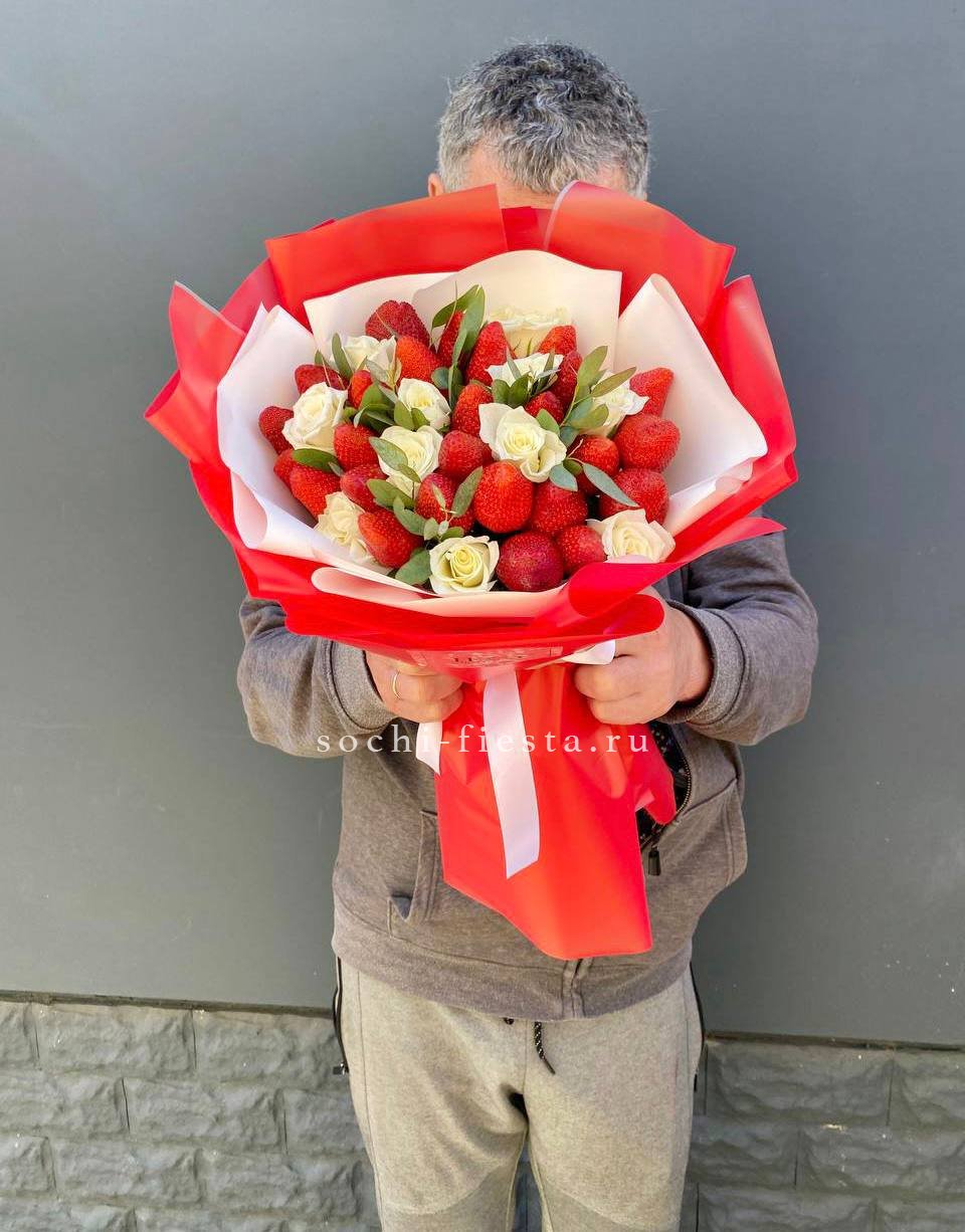 Состав: 300-400г. ароматной клубники, кустовая роза, эвкалипт, лента, дизайнерская бумага.