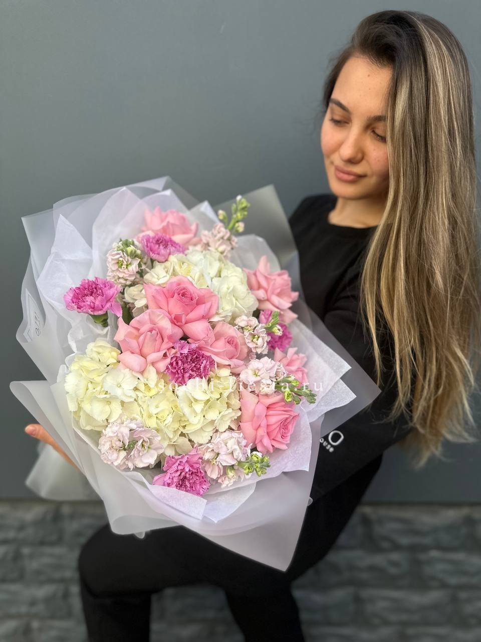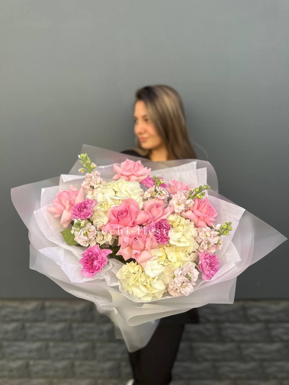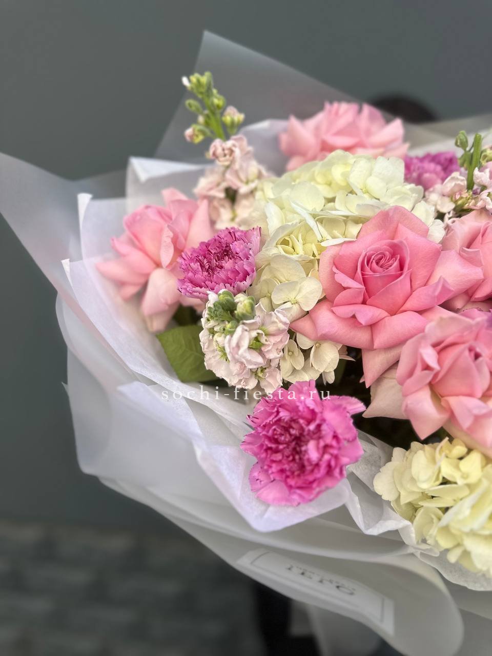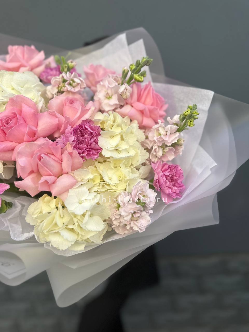 Авторский букет в составе которого: Маттиола, розовые розы, гортензии, диантусы, лента и дизайнерская пленка.
