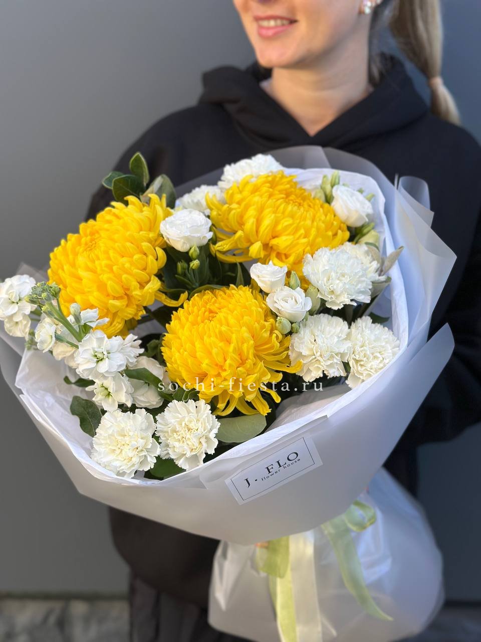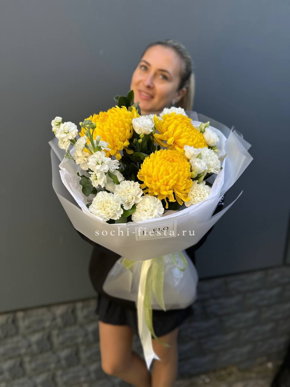 Состав: маттиола, хризантема одноголовая, эустома, диантус., лента, дизайнерская пленка, тишью