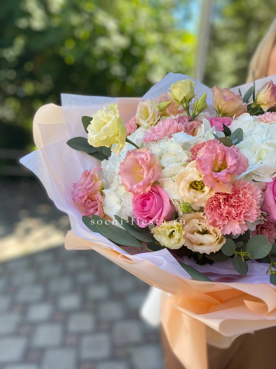 Состав: розовая роза, гортензия, диантус, эустома, эвкалипт, лента, дизайнерская упаковка