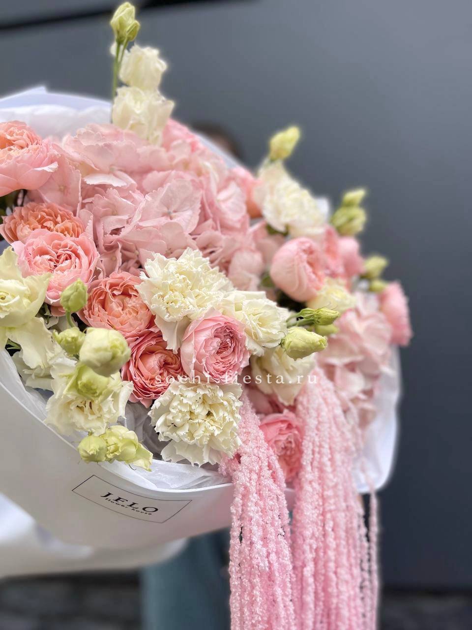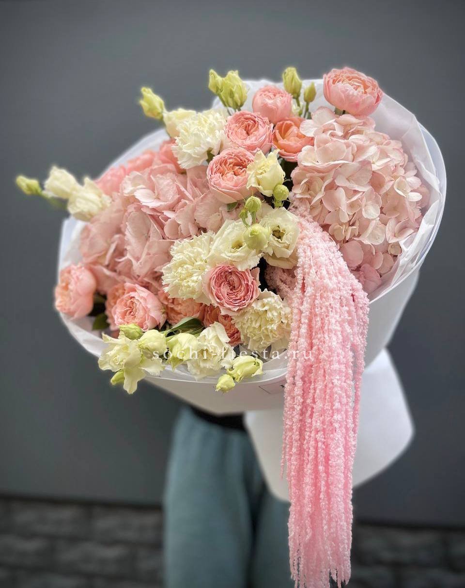 Авторский букет в составе которого:  кустовые розы, гортензии, диантусы, эустома, амарант, лента и дизайнерская пленка.