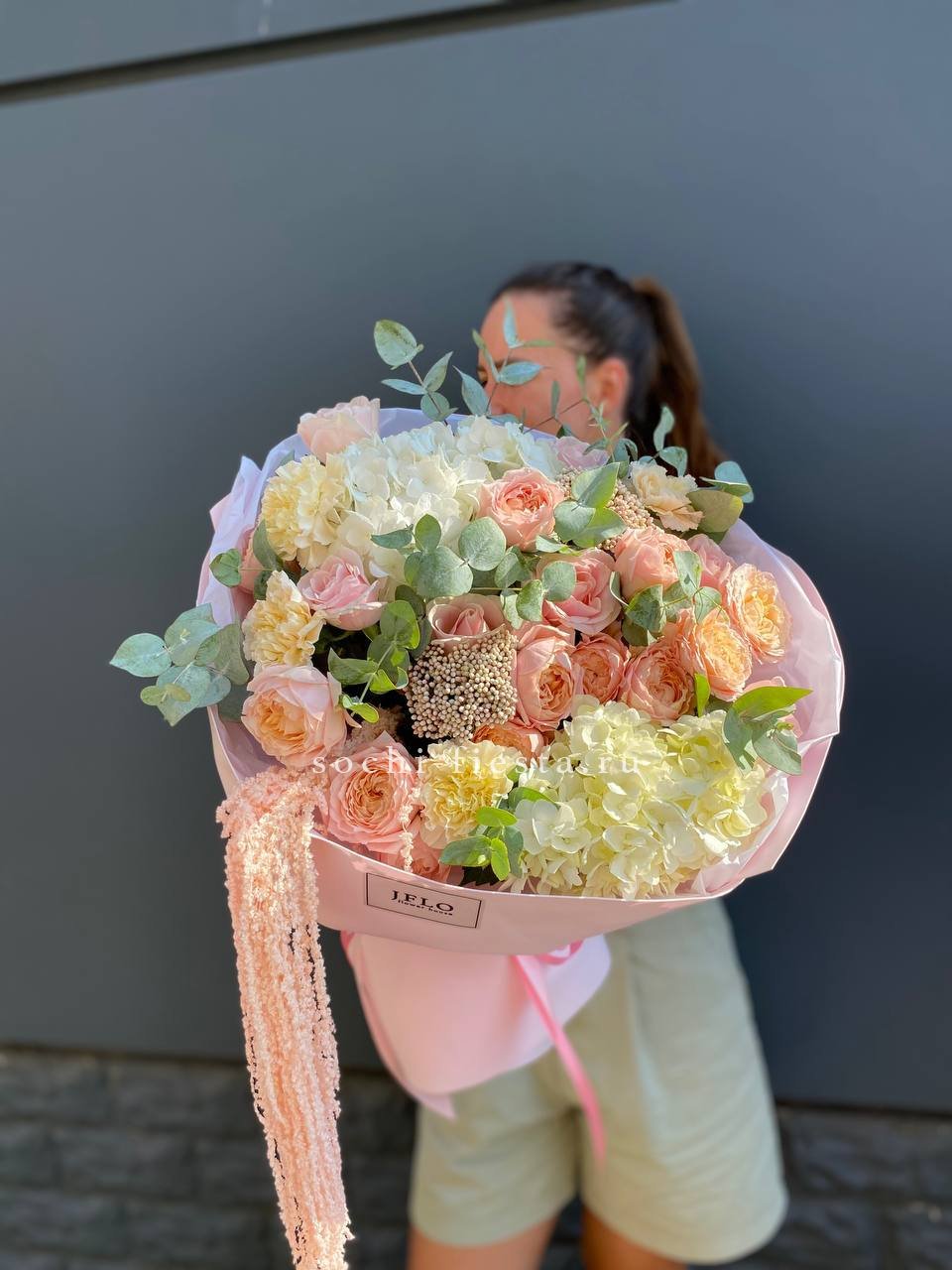 Состав: джульетта, озатамус, диантус, гортензия, розовая роза, амарант, оформление