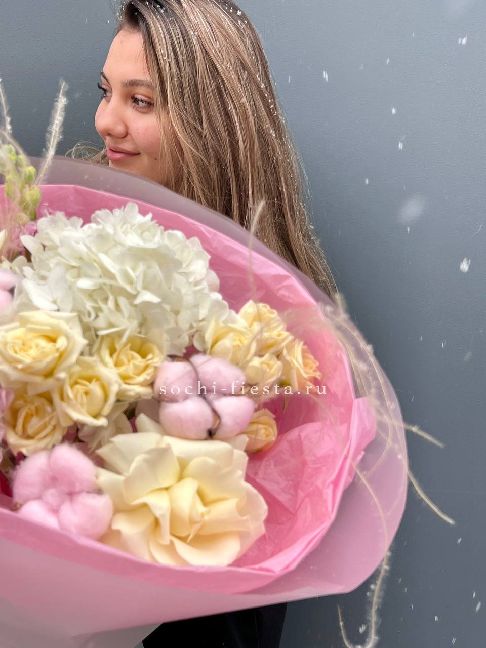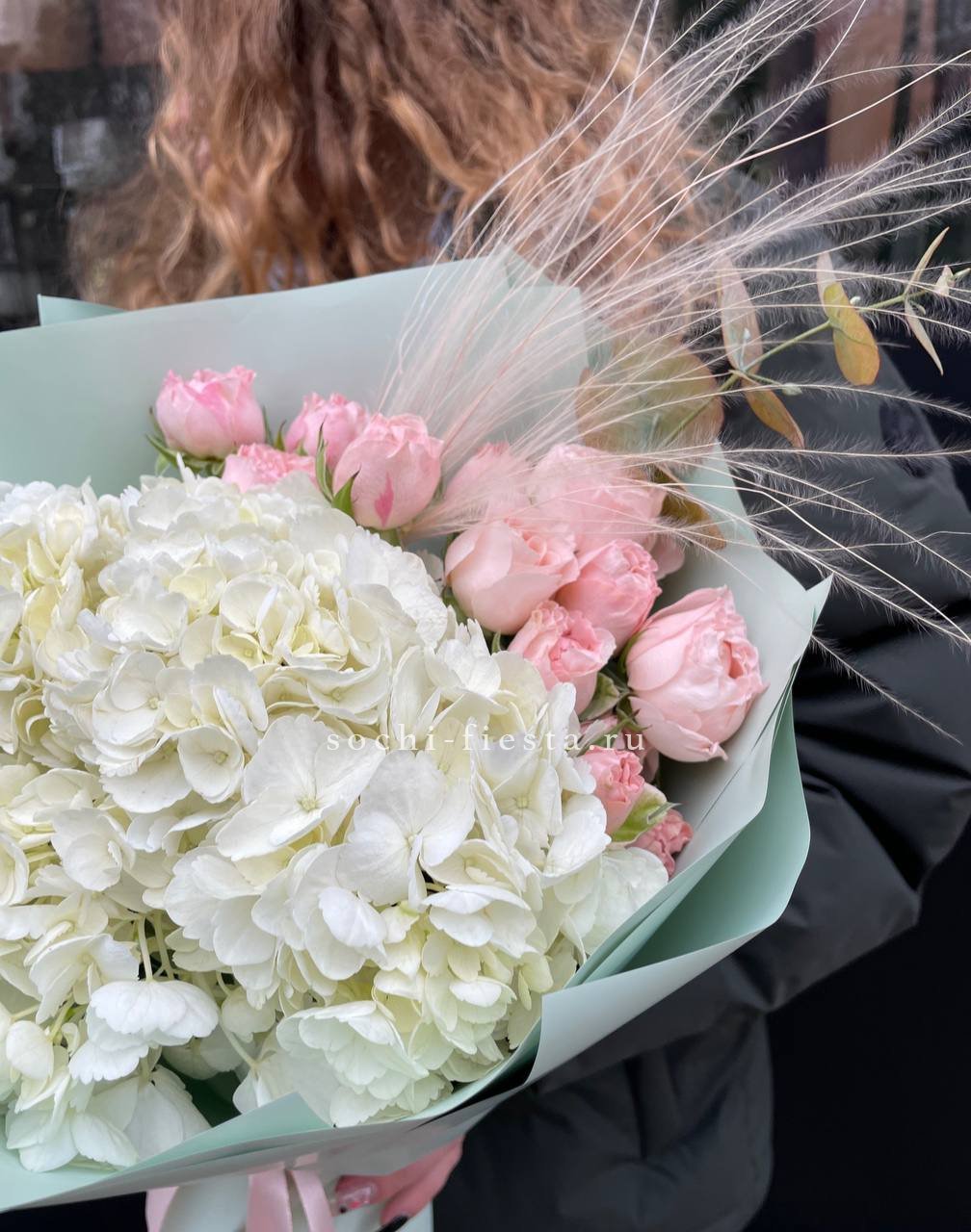 Состав: белые французские розы, гортензия, маттиола, хлопок, ковыль (стифа), пионовидные розы, авторское оформление.