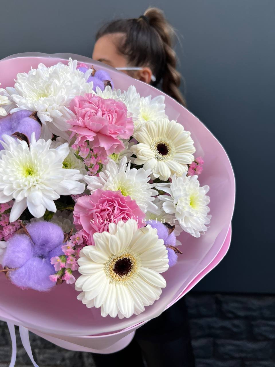 Состав: герберы, хризантемы, статица (аналог), диантусы, хлопок, упаковка