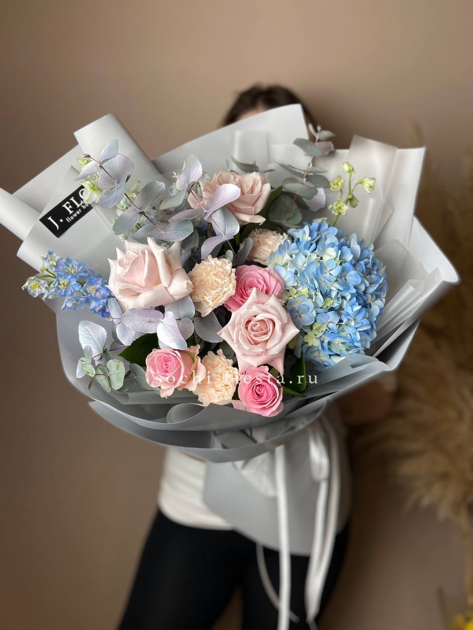 Состав: гортензия 3шт, роза 3шт, эустома 2шт, бомбастик 2шт,  эвкалипт, лента, дизайнерская пленка