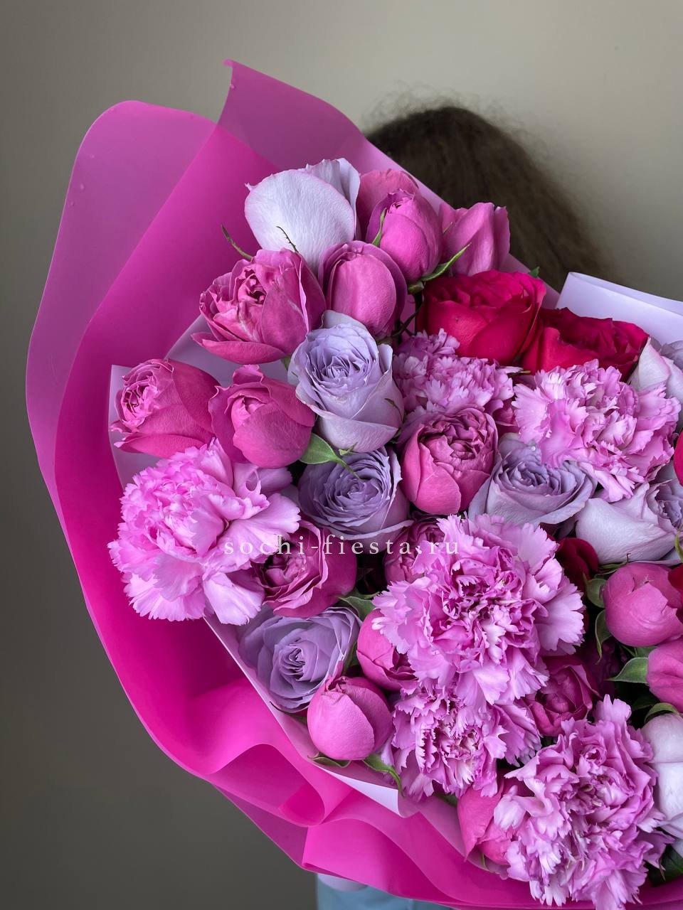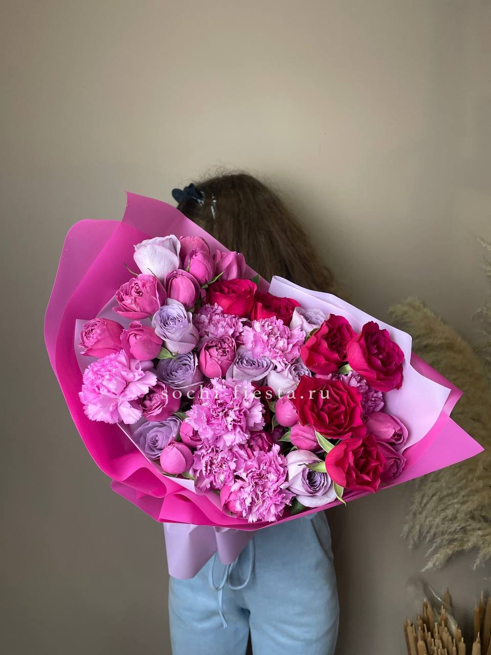 Состав: роза 16 шт., мисти баблс 7 шт., диантус 7 шт., лента, дизайнерская пленка