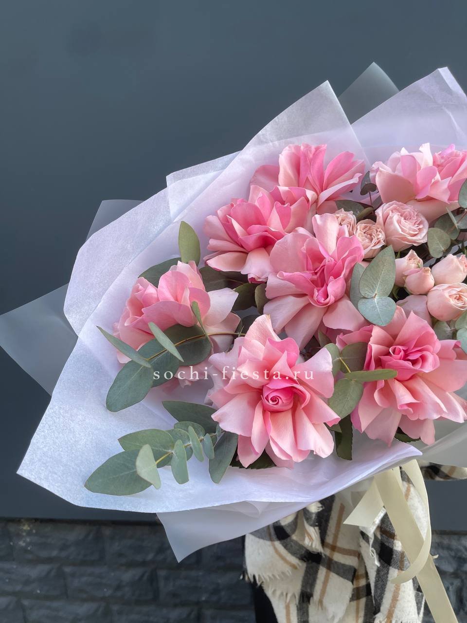 Состав: Розовые розы, пионовидная кустовая роза, эвкалипт,  лента, авторская упаковка