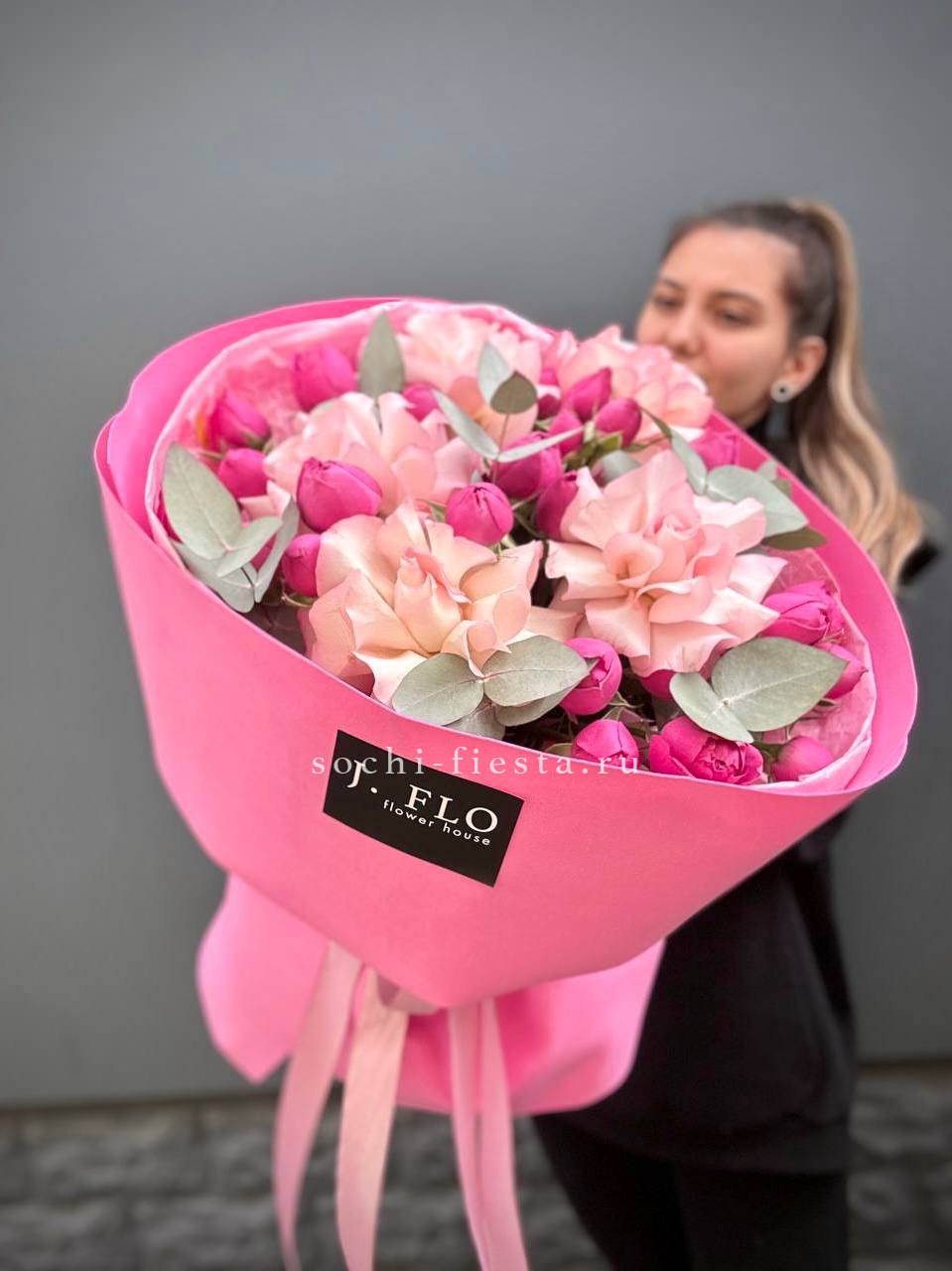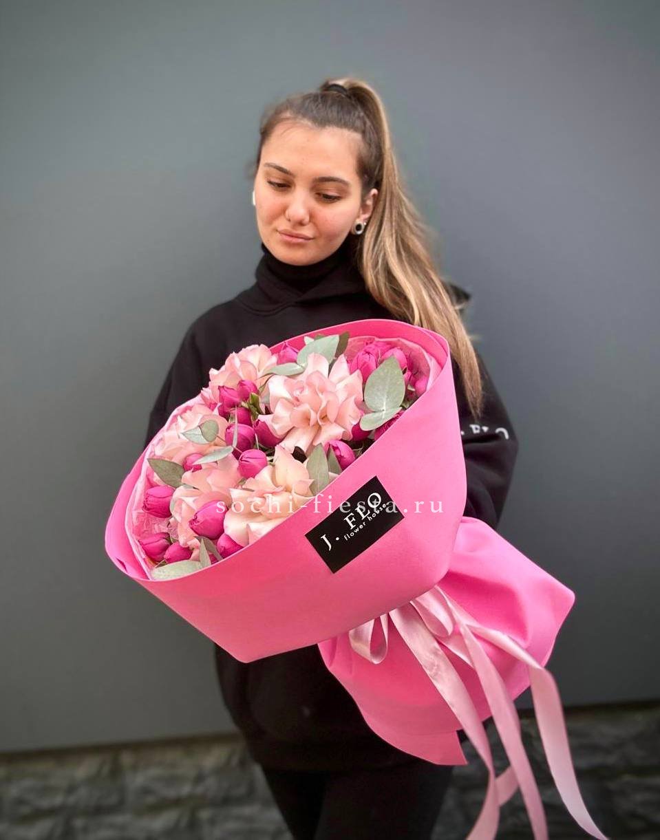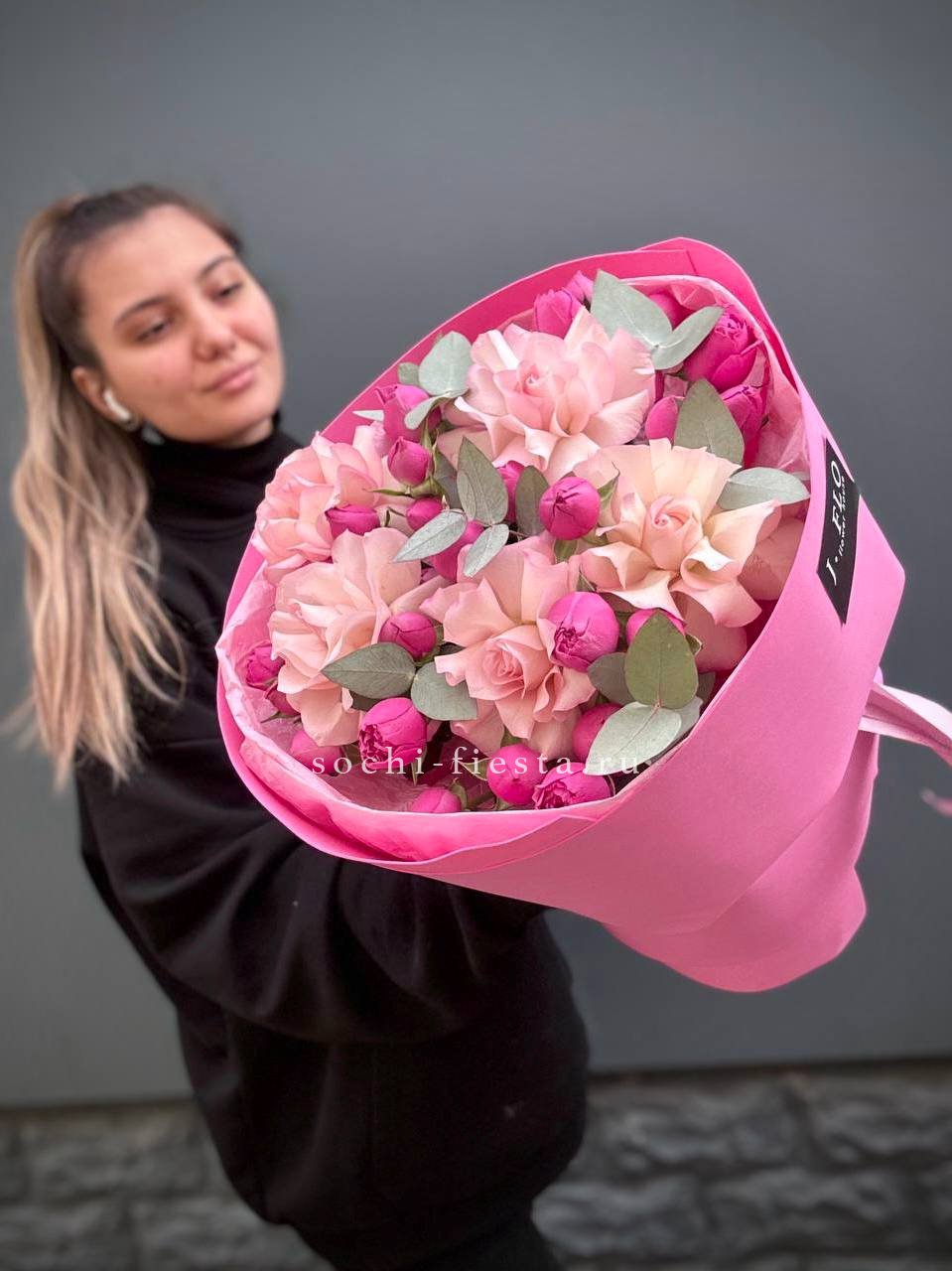 Состав: французские розы, пионовидные розы мисти бабблс, эвкалипт, оформление