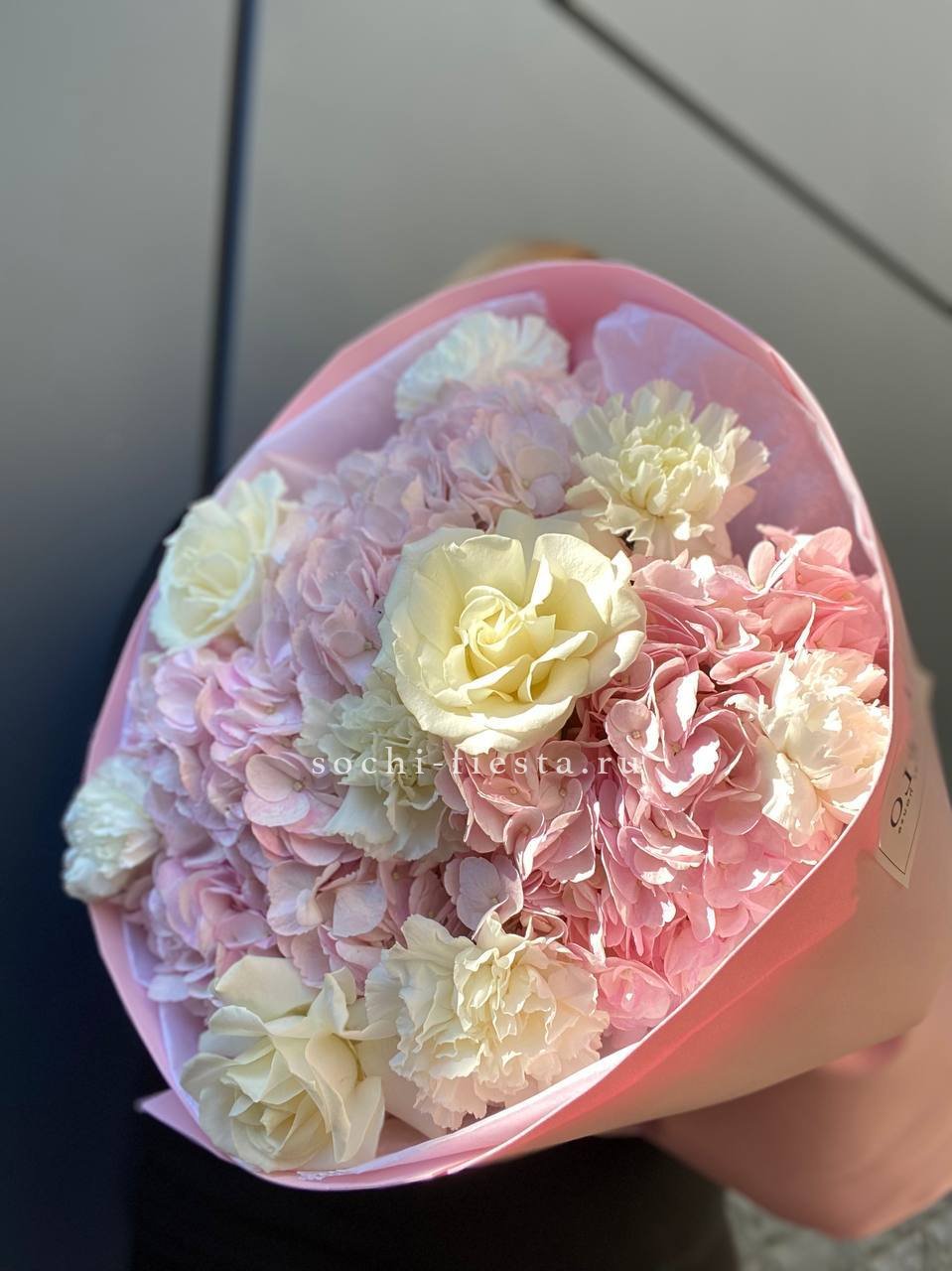 Состав: гортензия, роза белая, диантус лента, дизайнерская пленка