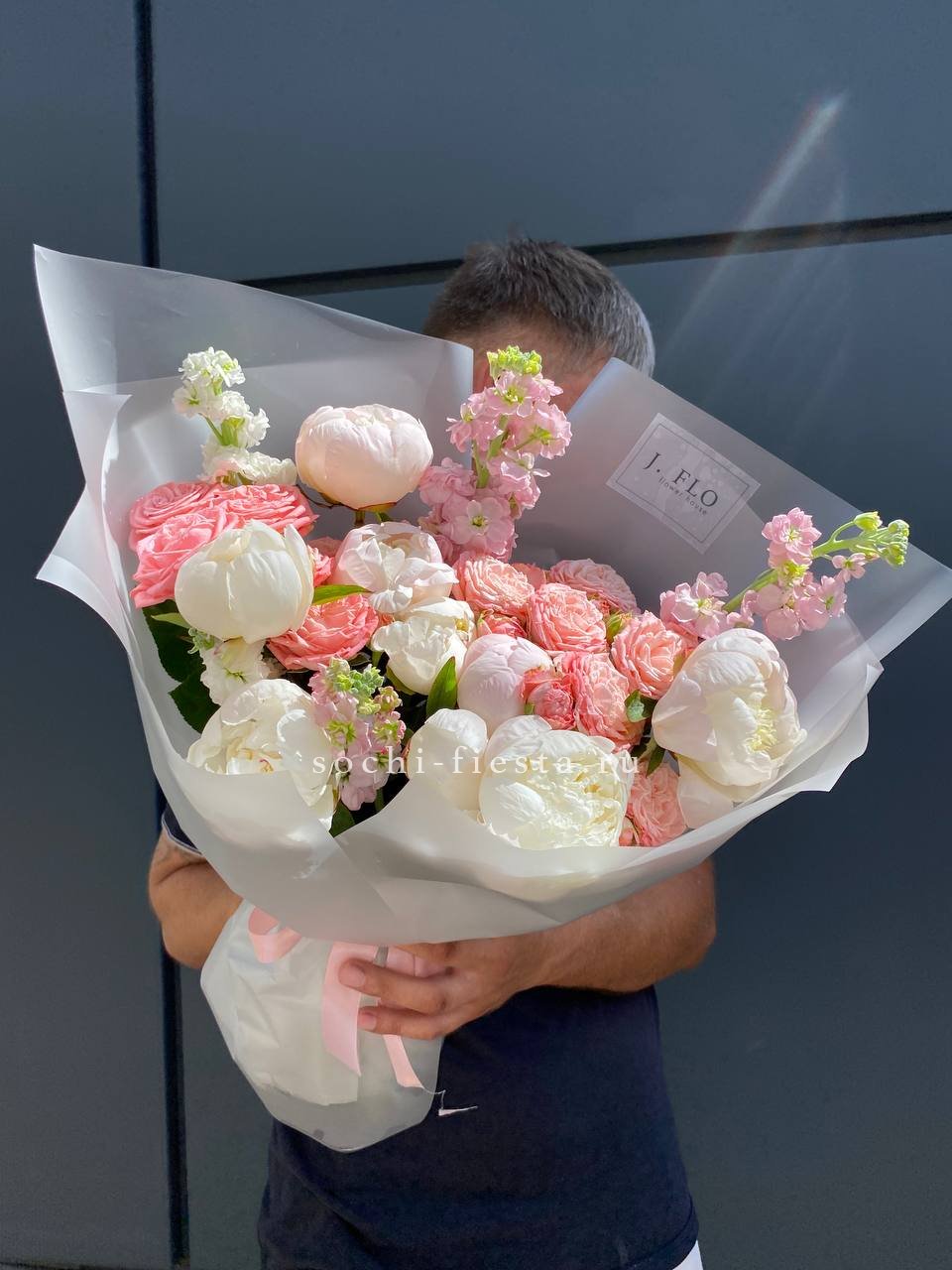 Состав: пионы, роза пионовидная, маттиола, лента, дизайнерская пленка