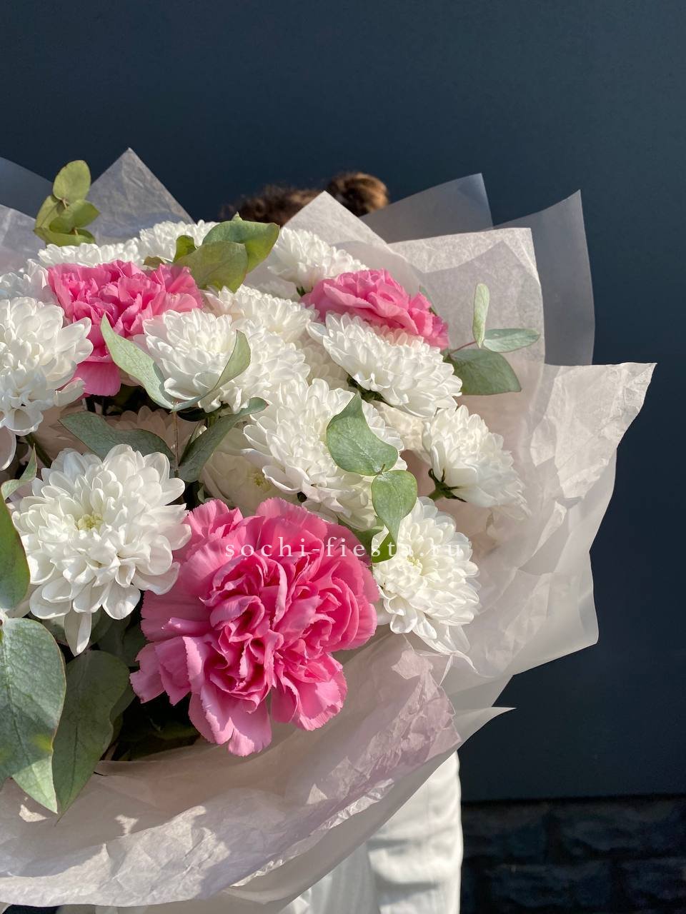 Состав: хризантема кустовая, диантусы, эвкалипт