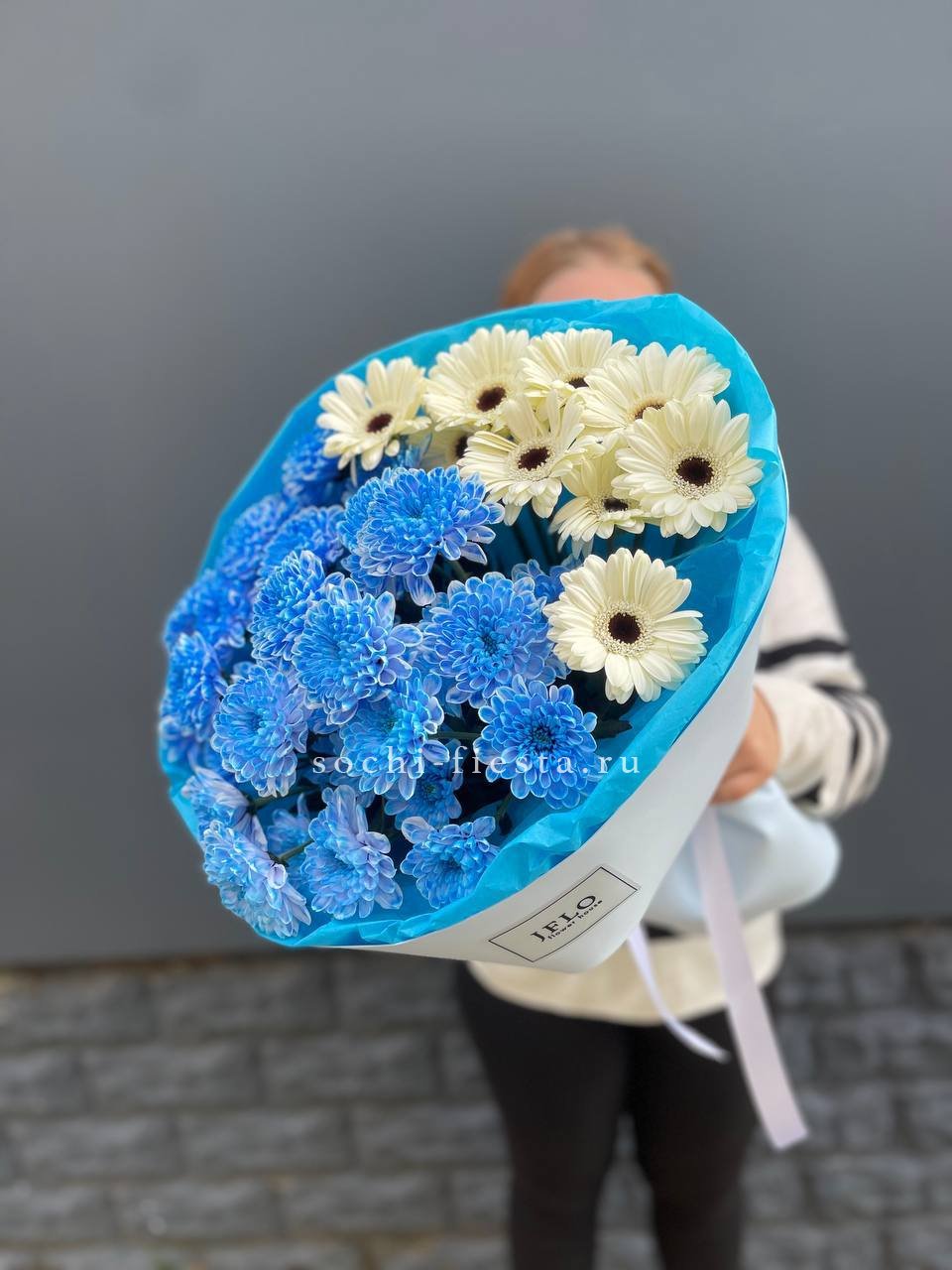 Состав: хризантема-5, гербера-9, упаковка, лента