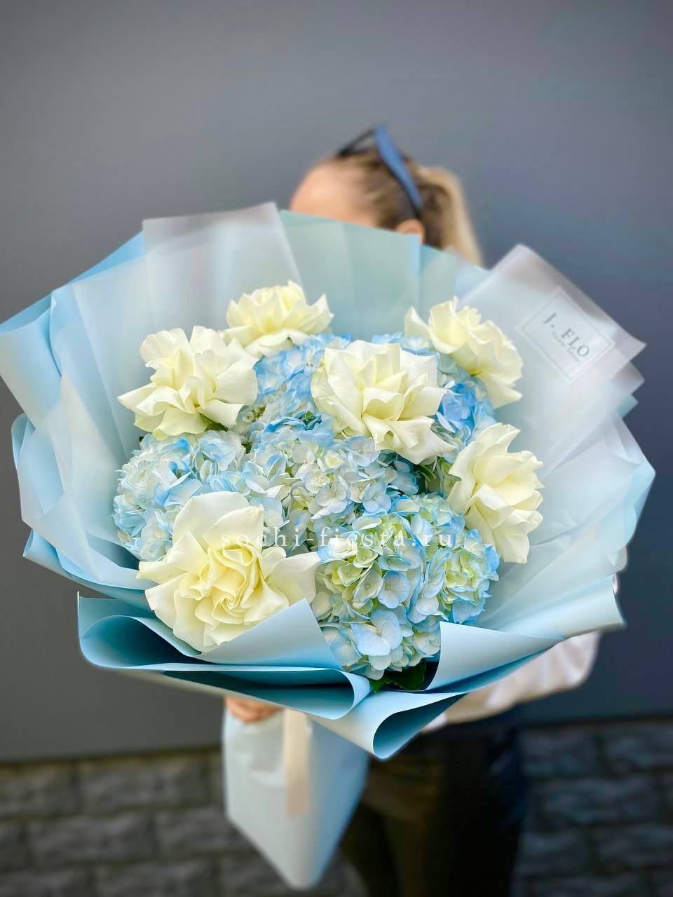 Для заказа товара " Букет из голубых гортензий и роз " с доставкой в Москве нажмите в корзину
