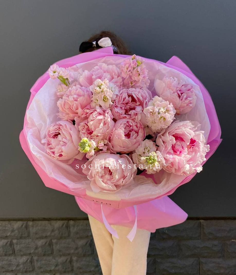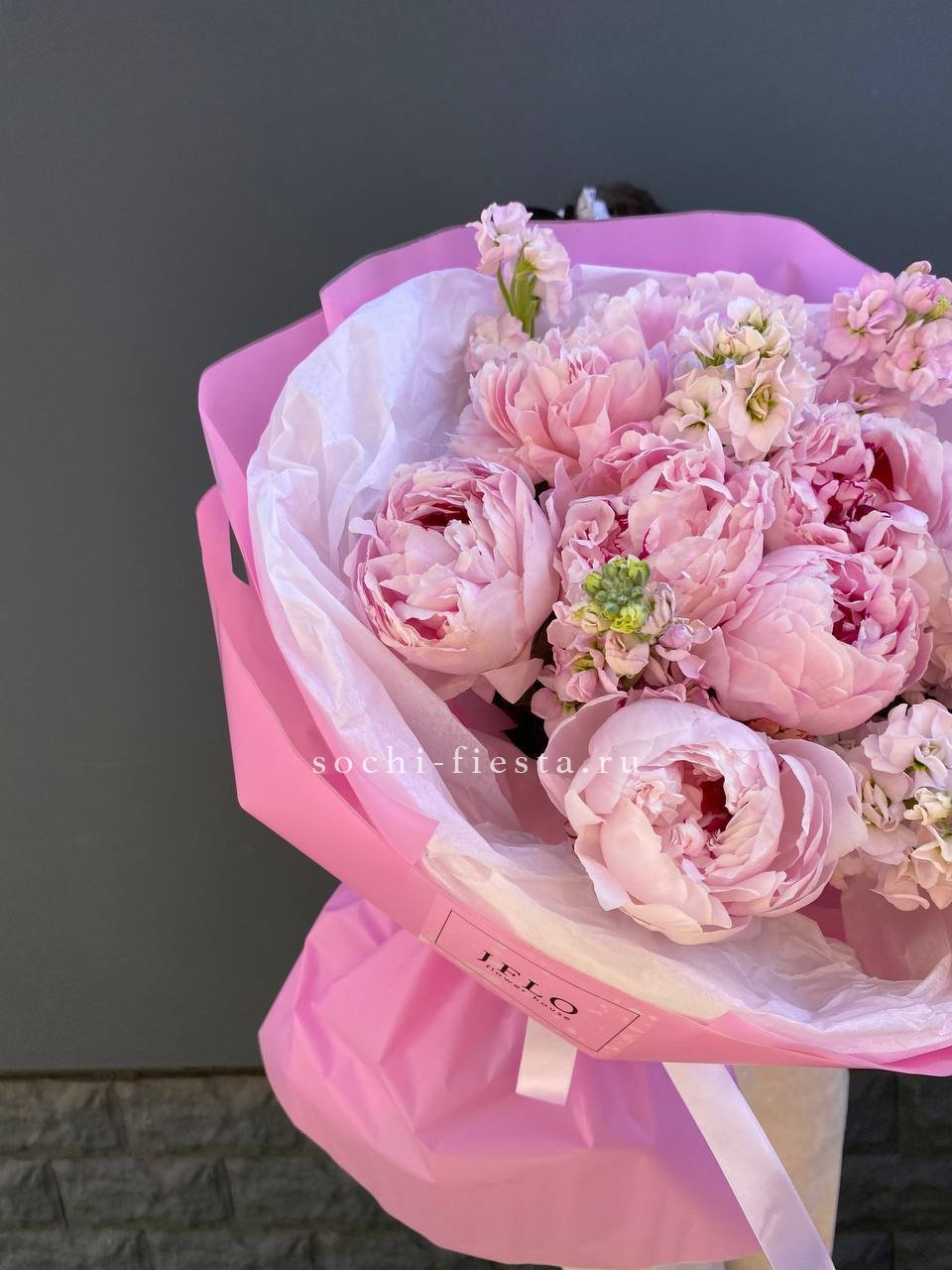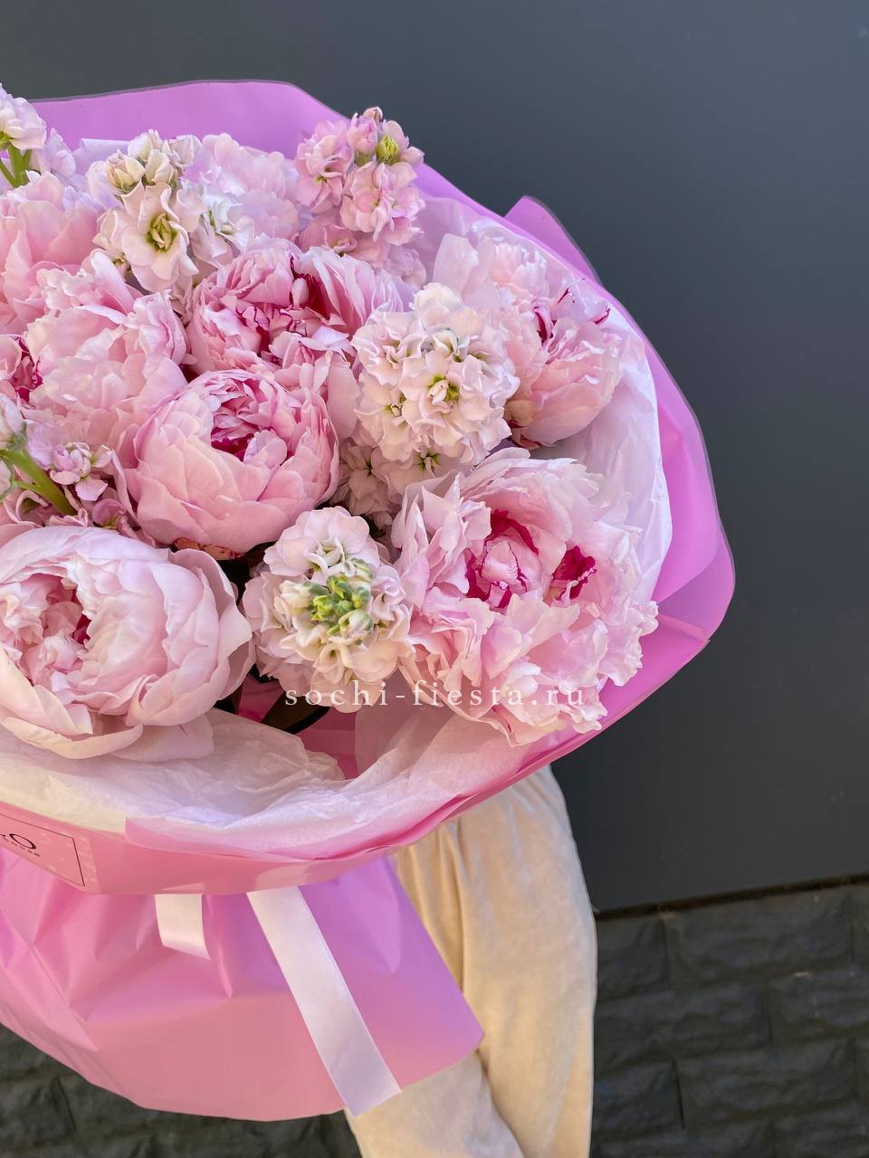 Состав: пионы, маттиола , тишью, пленка, лента.