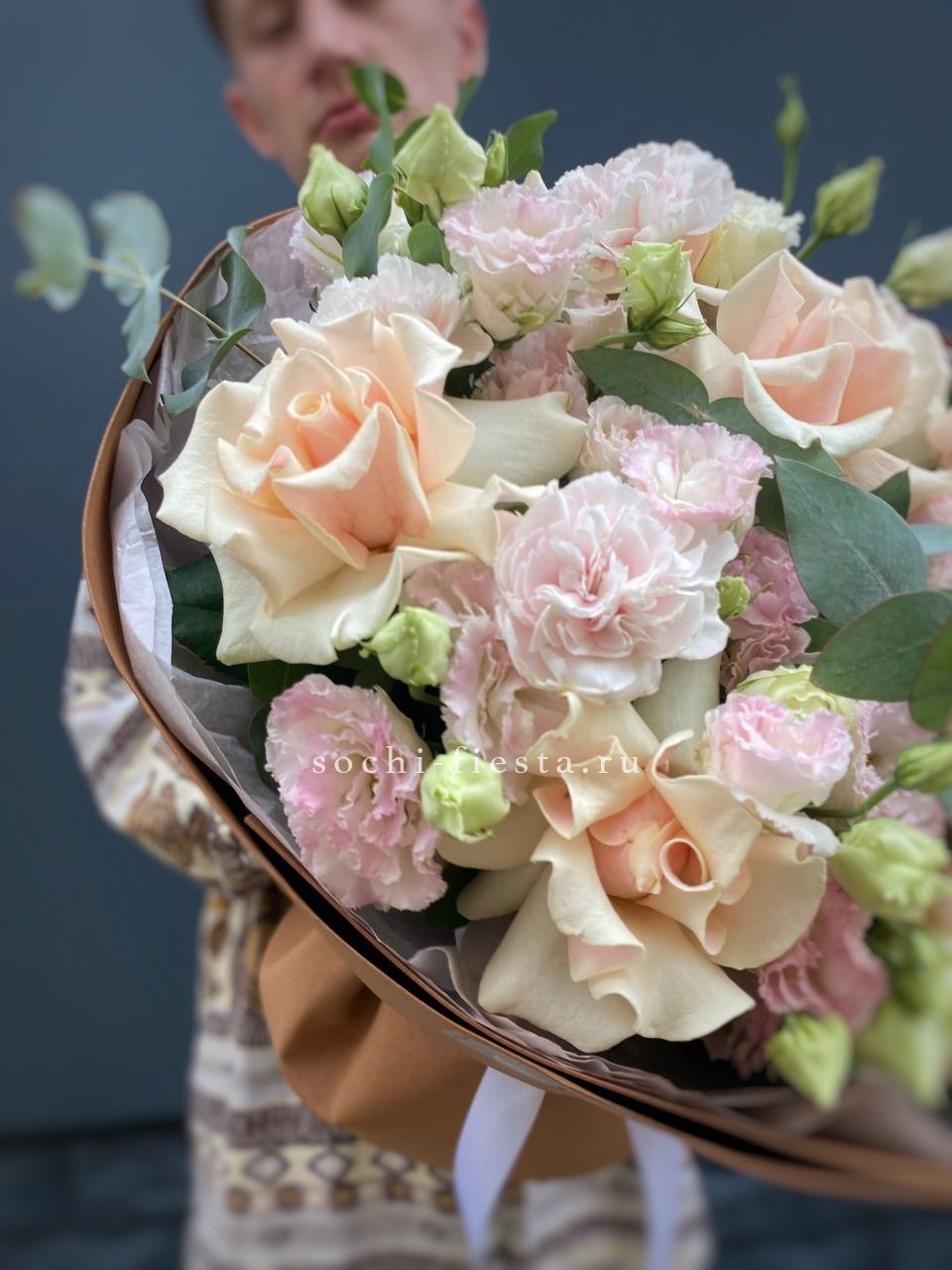 Состав: кремовые розы, эустомы (тон отличается от сезона), диантус, эвкалипт, оформление