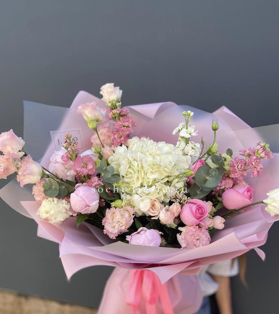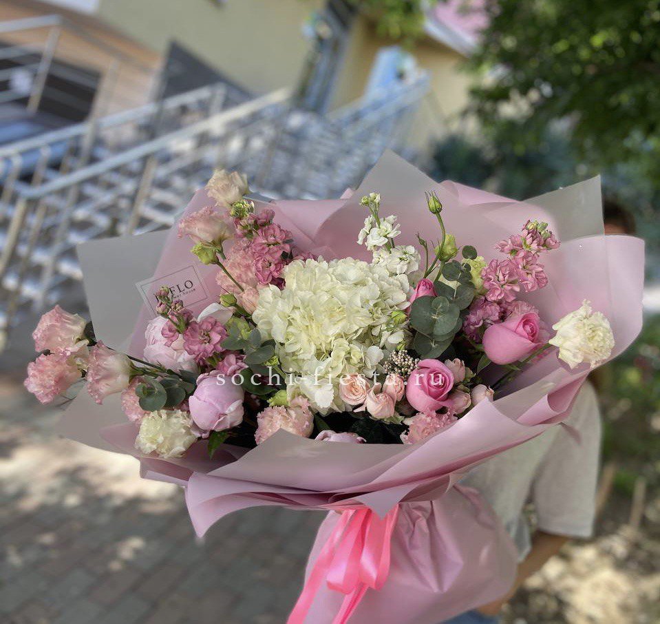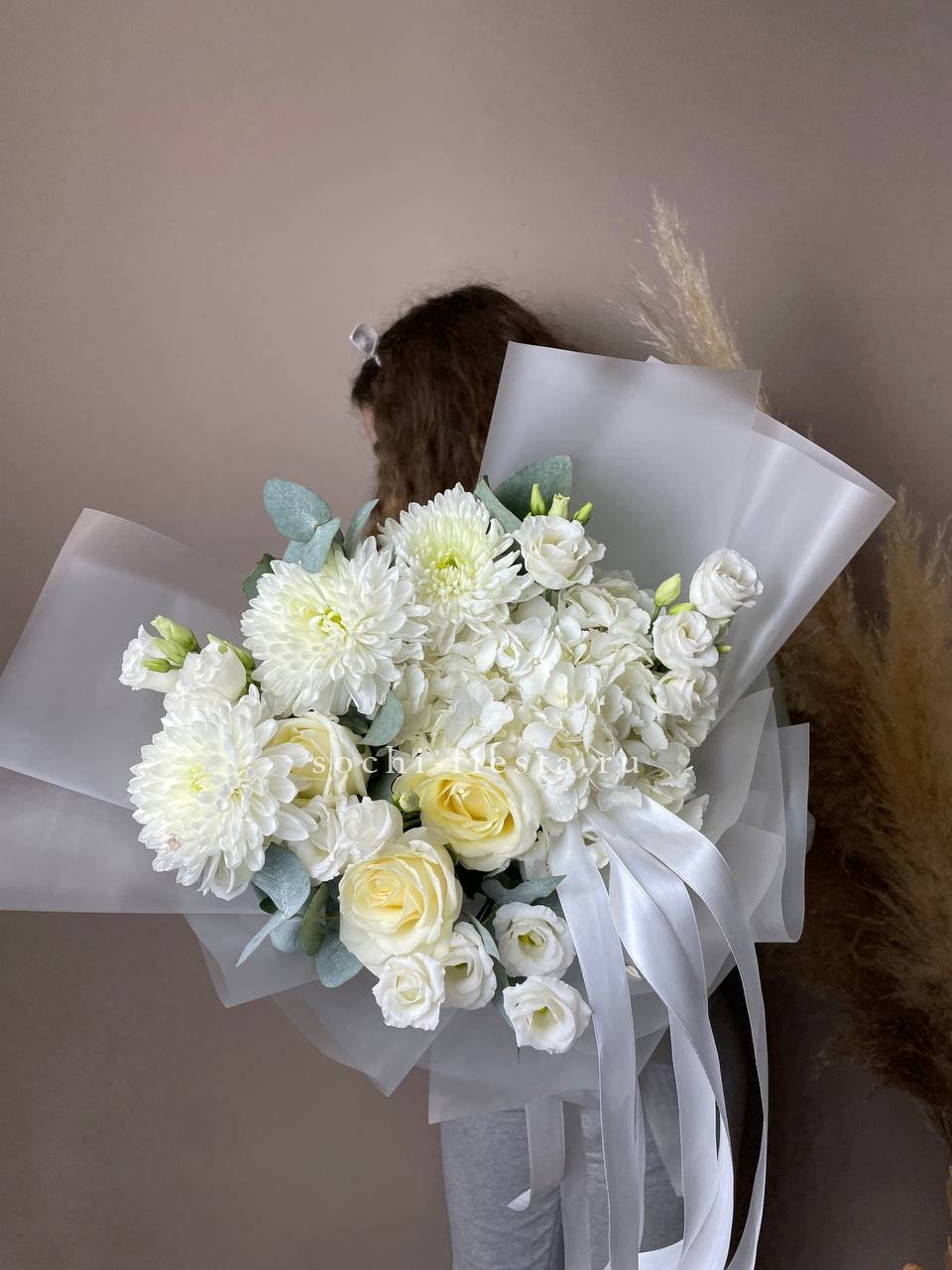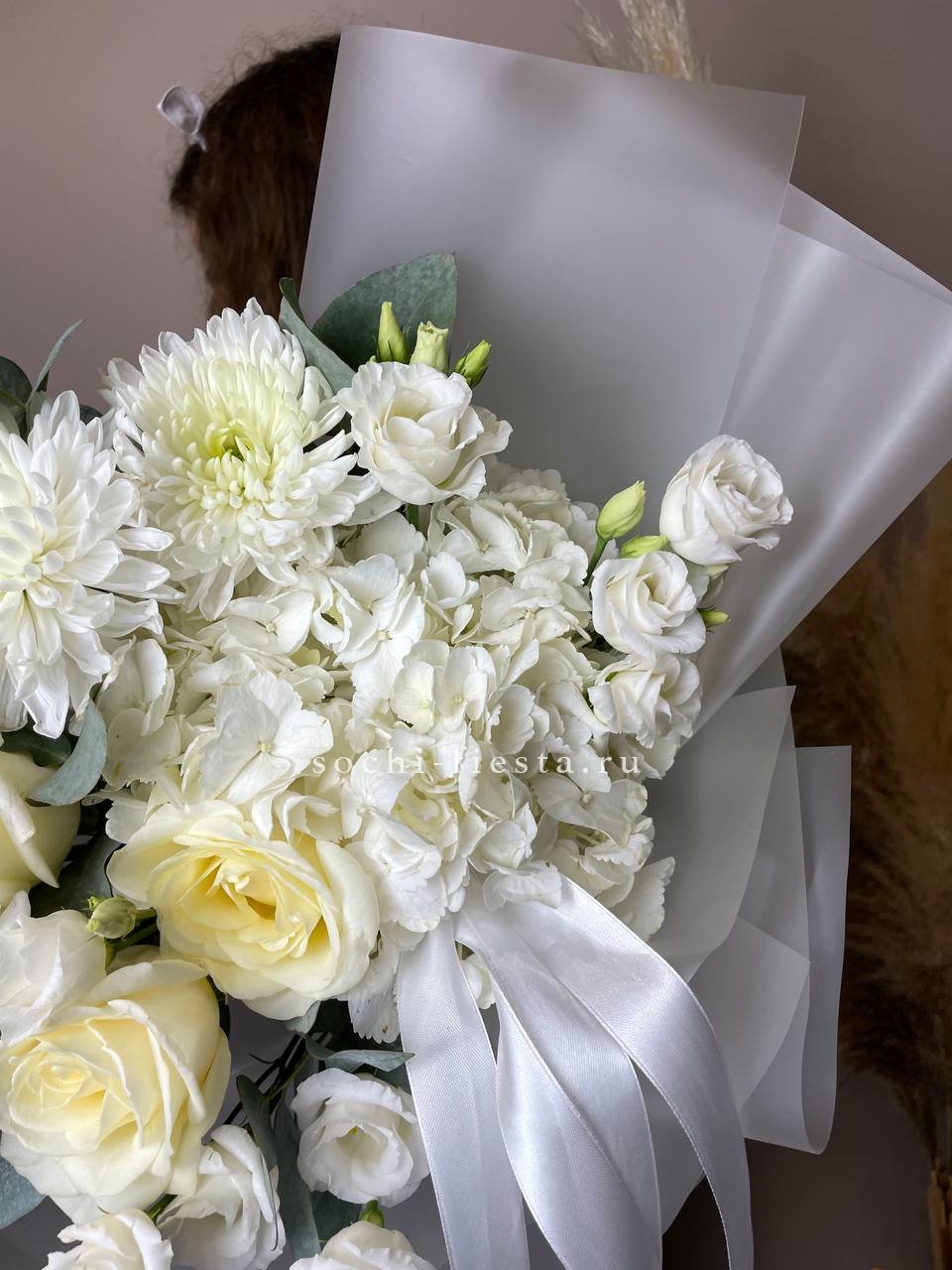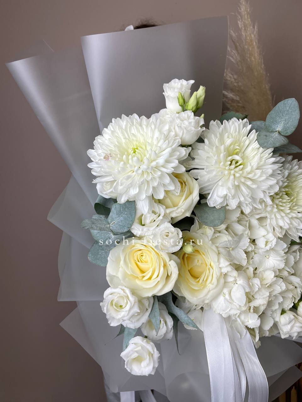 Состав: гортензия, хризантема, роза, эустома, упаковка, лента