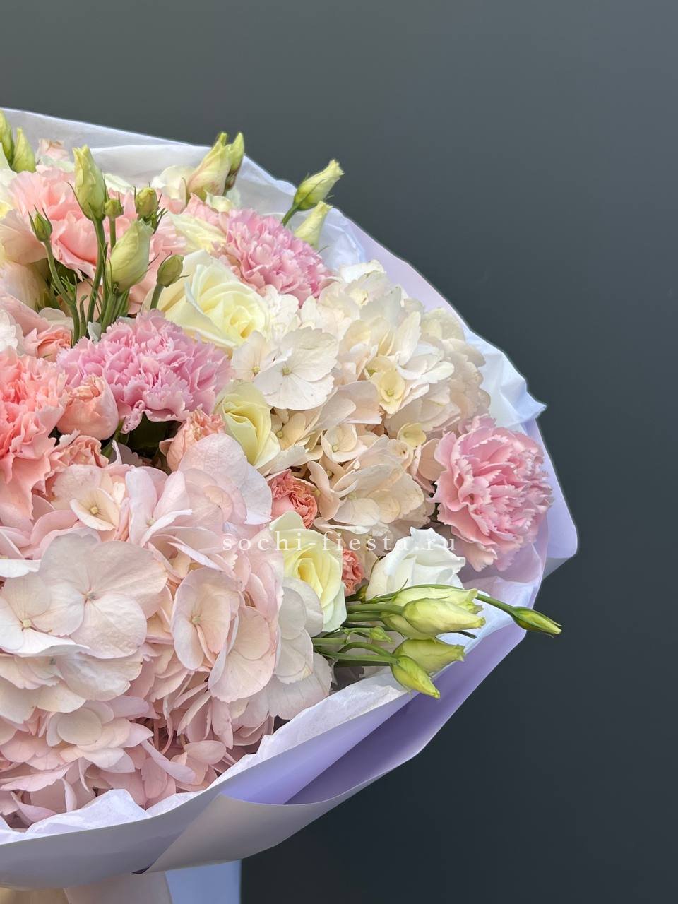 Состав: гортензии, розы, эустомы, диантусы. оформление