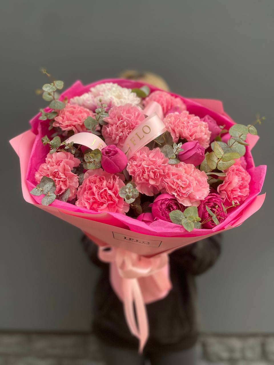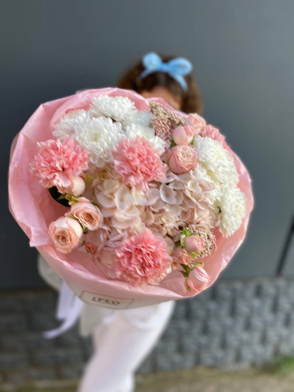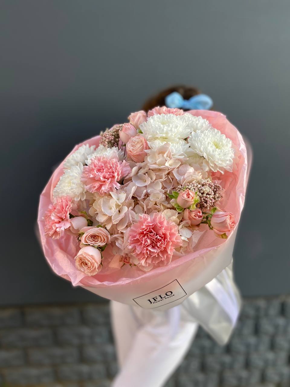 Яркая композиция объединяет пышную гортензию, игривые соцветия диантуса и солнечные хризантемы. Бомбастик добавляет объёма, а озотамнус создаёт лёгкую воздушность между крупными бутонами. Букет радует глаз насыщенными красками и жизнерадостным характером.