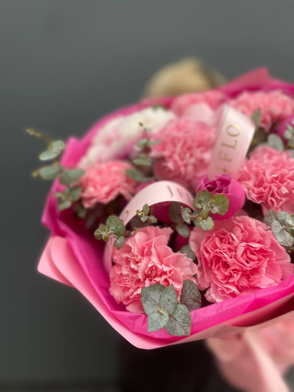 гортензия, диантус, хризантема, бомбастик, озатамус, пленка.