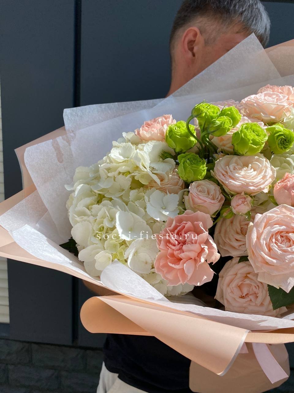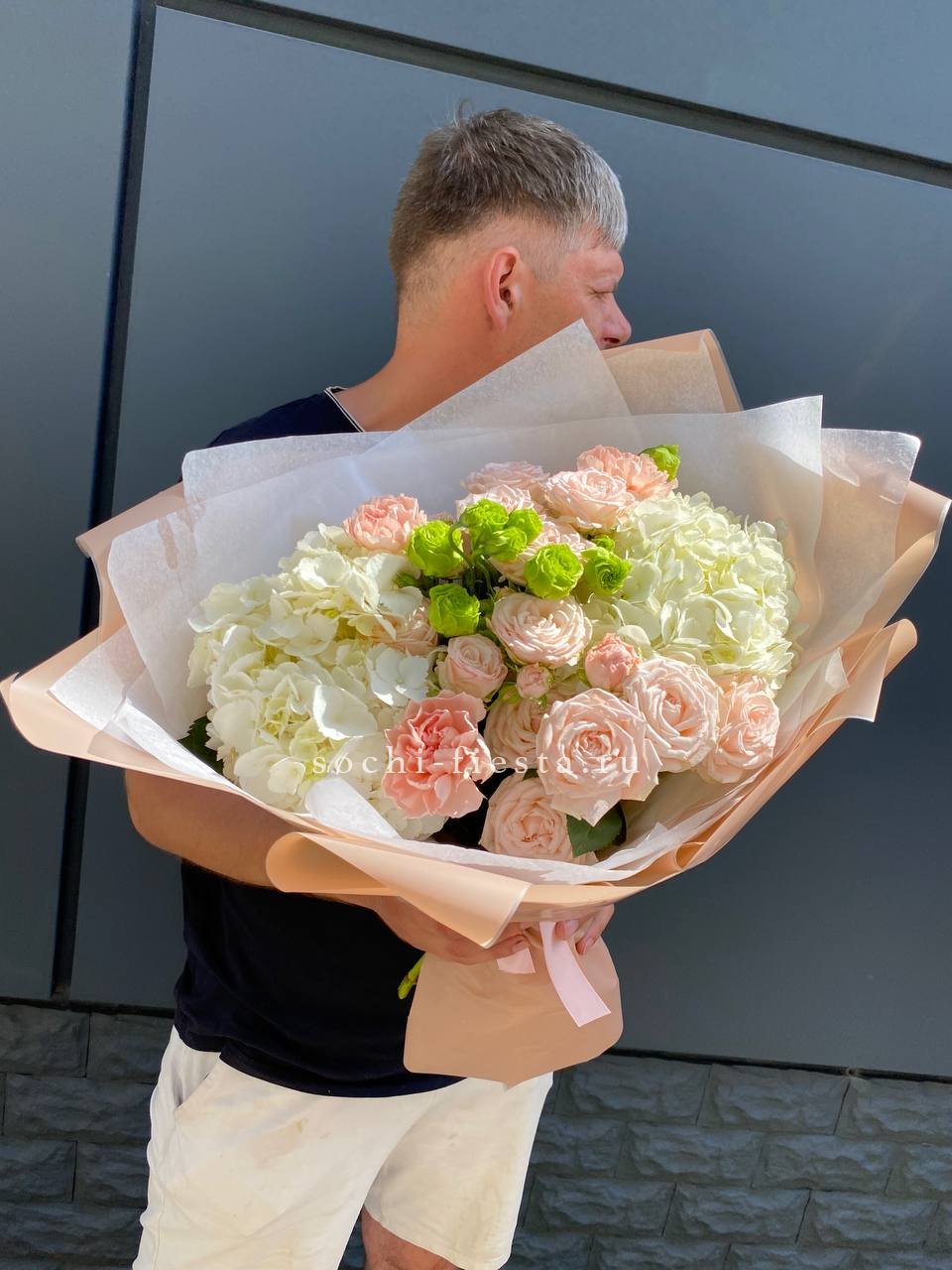 Состав: эустома, кустовые розы, белые  розы, гортензия, пионы(замена в зависимости от сезона) лента, крафт