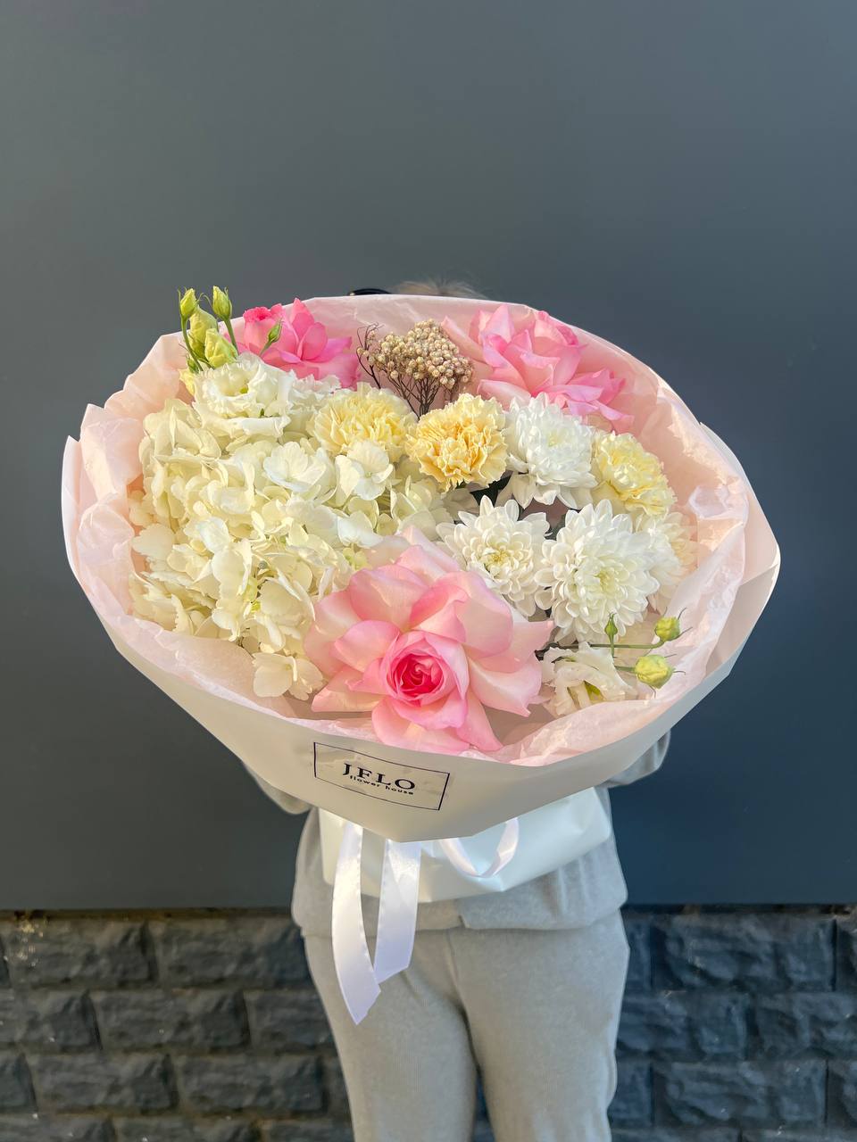Воздушная композиция с крупными соцветиями гортензии и пышными розами создает ощущение легкости и объема. Эвкалипт добавляет свежести, а бомбастик расставляет яркие акценты между бутонами.