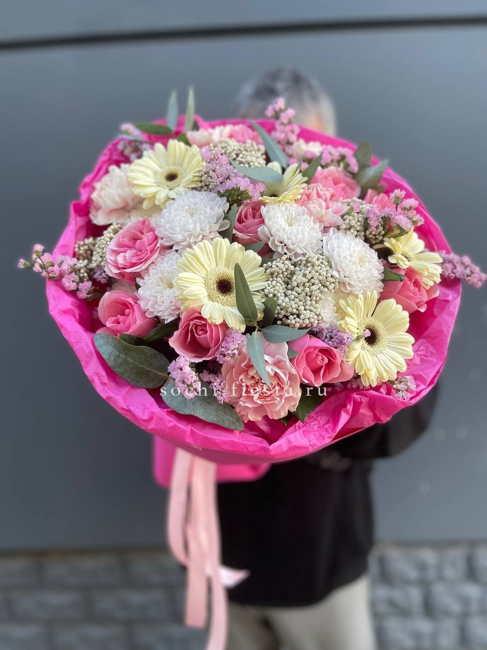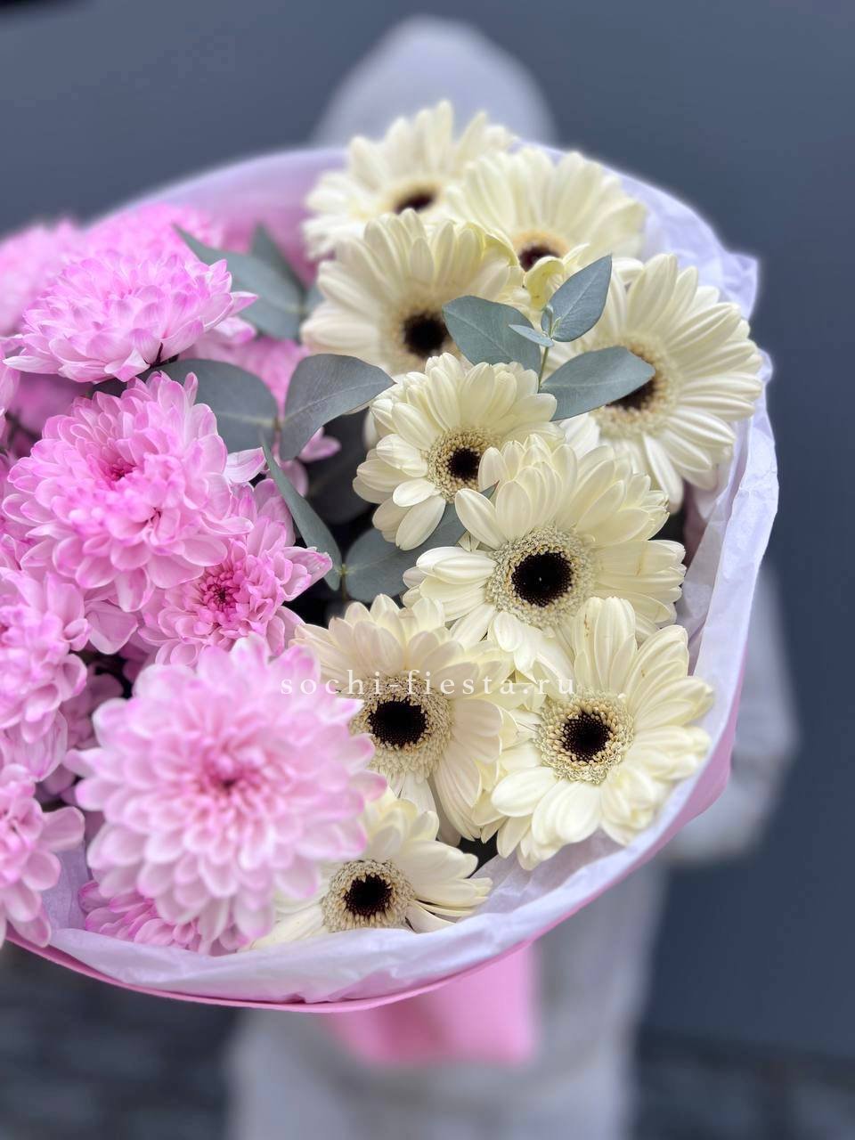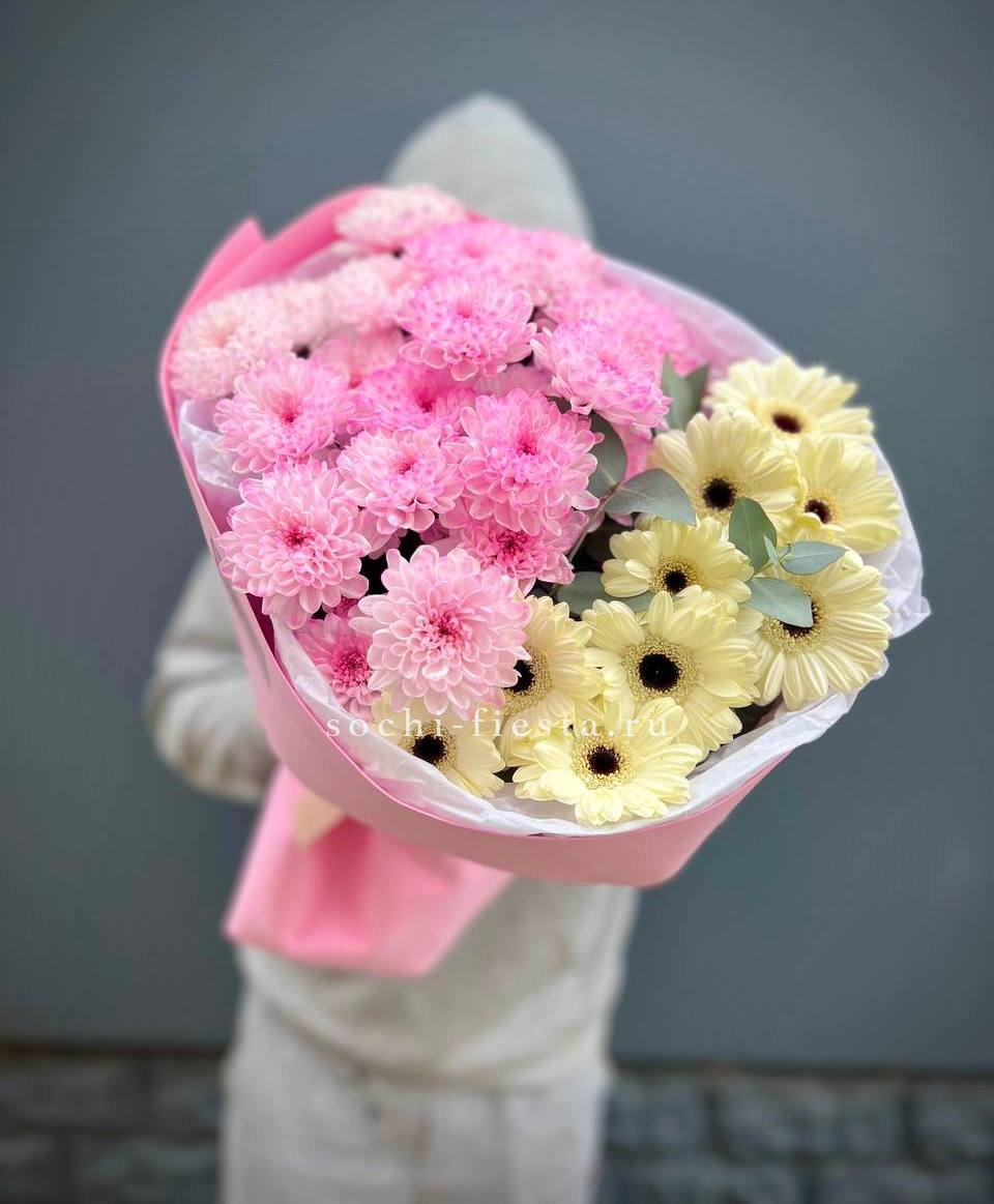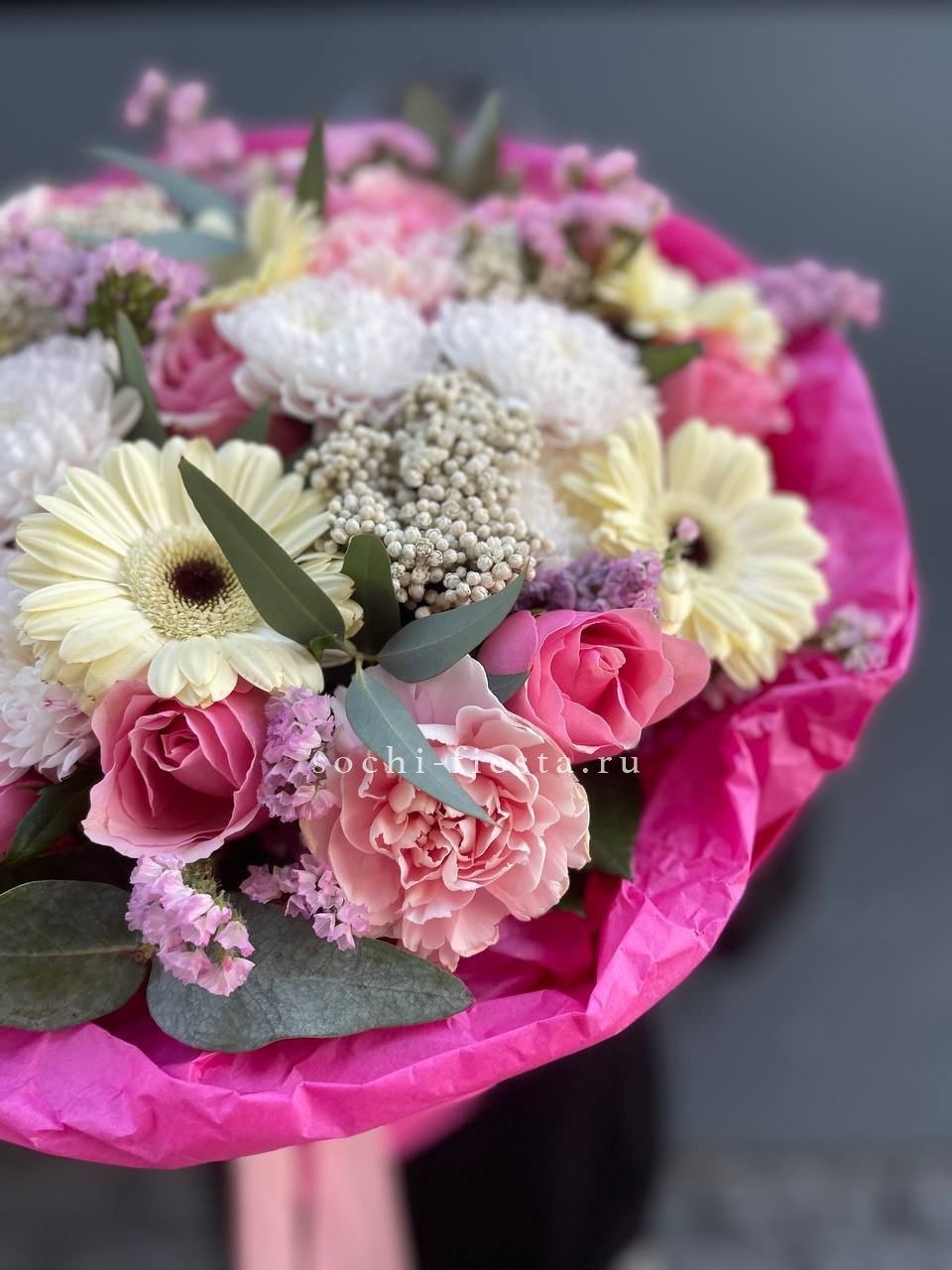 Состав: сборный букет из стойких цветов гербера, хризантема, розы, озатамус, эвкалипт, диантус, статица в оформлении