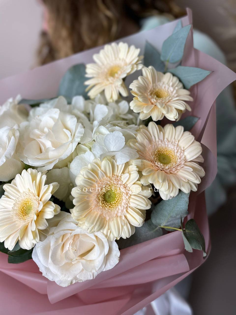 Состав букета: гортензия, гербера, роза, эвкалипт, оформление, лента
