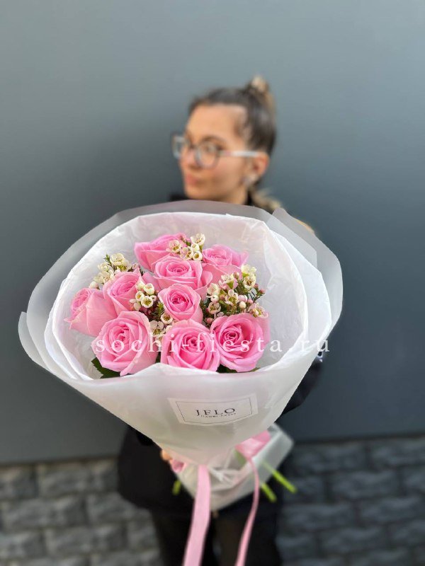 Состав: розовые розы, хамелациум (аналог),  лента, пленка, тишью