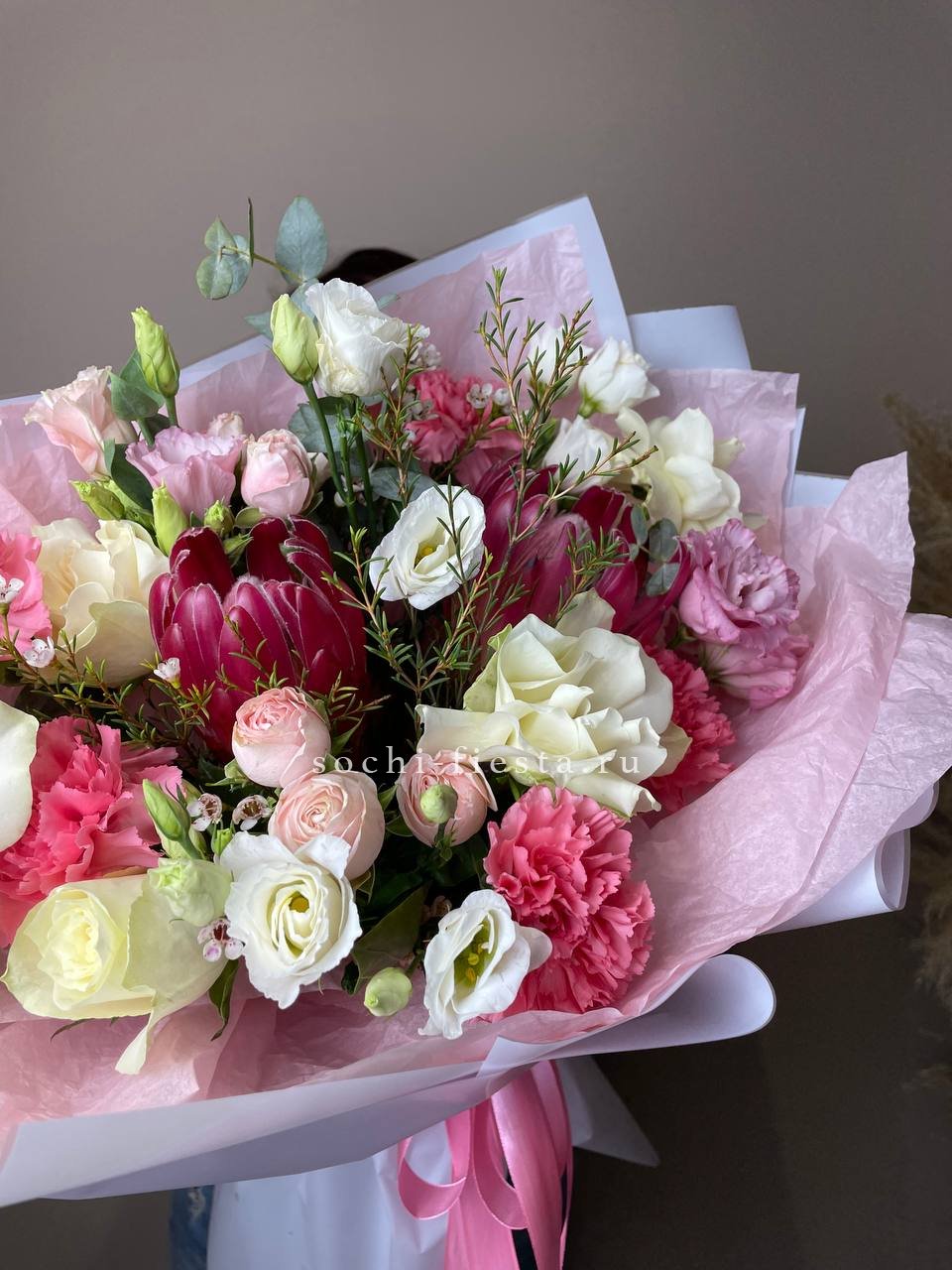 Состав: протея, эустома, роза, пионовидная роза, диантус, зелень декортивная, эвкалипт, оформление