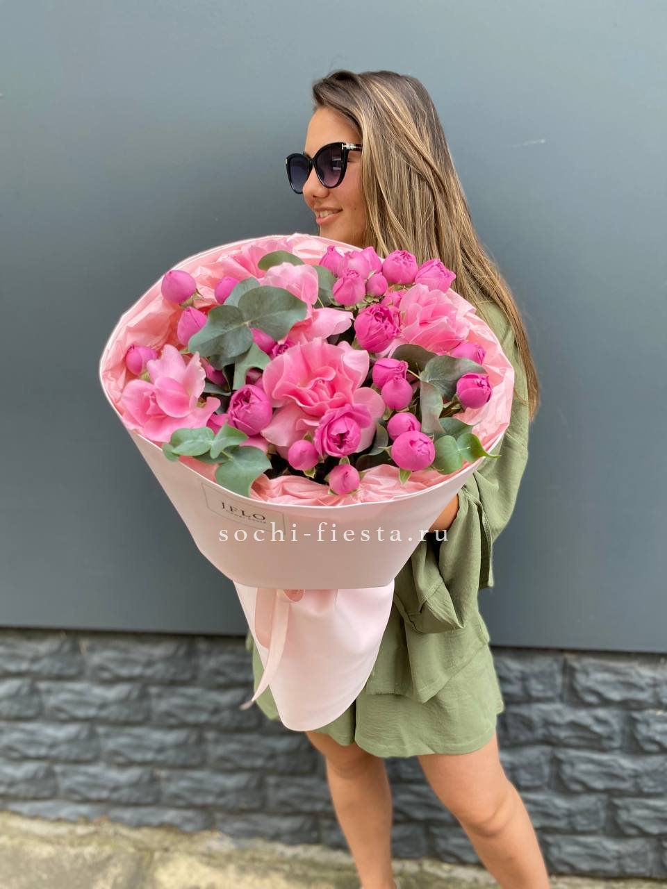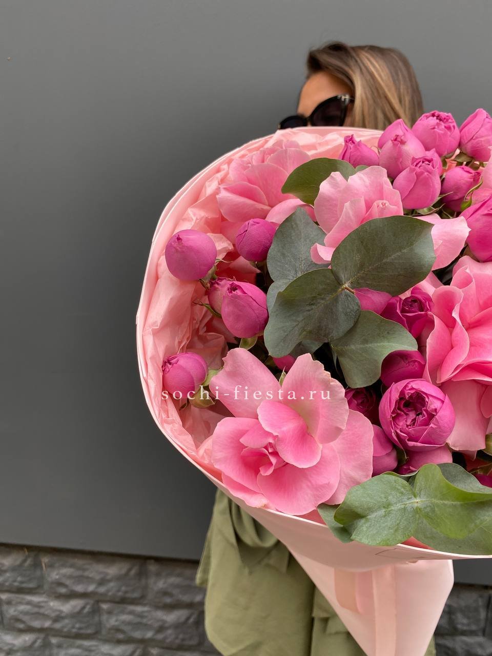Состав: пионовидные розы, розовые розы, эвкалипт, лента, дизайнерская упаковка.