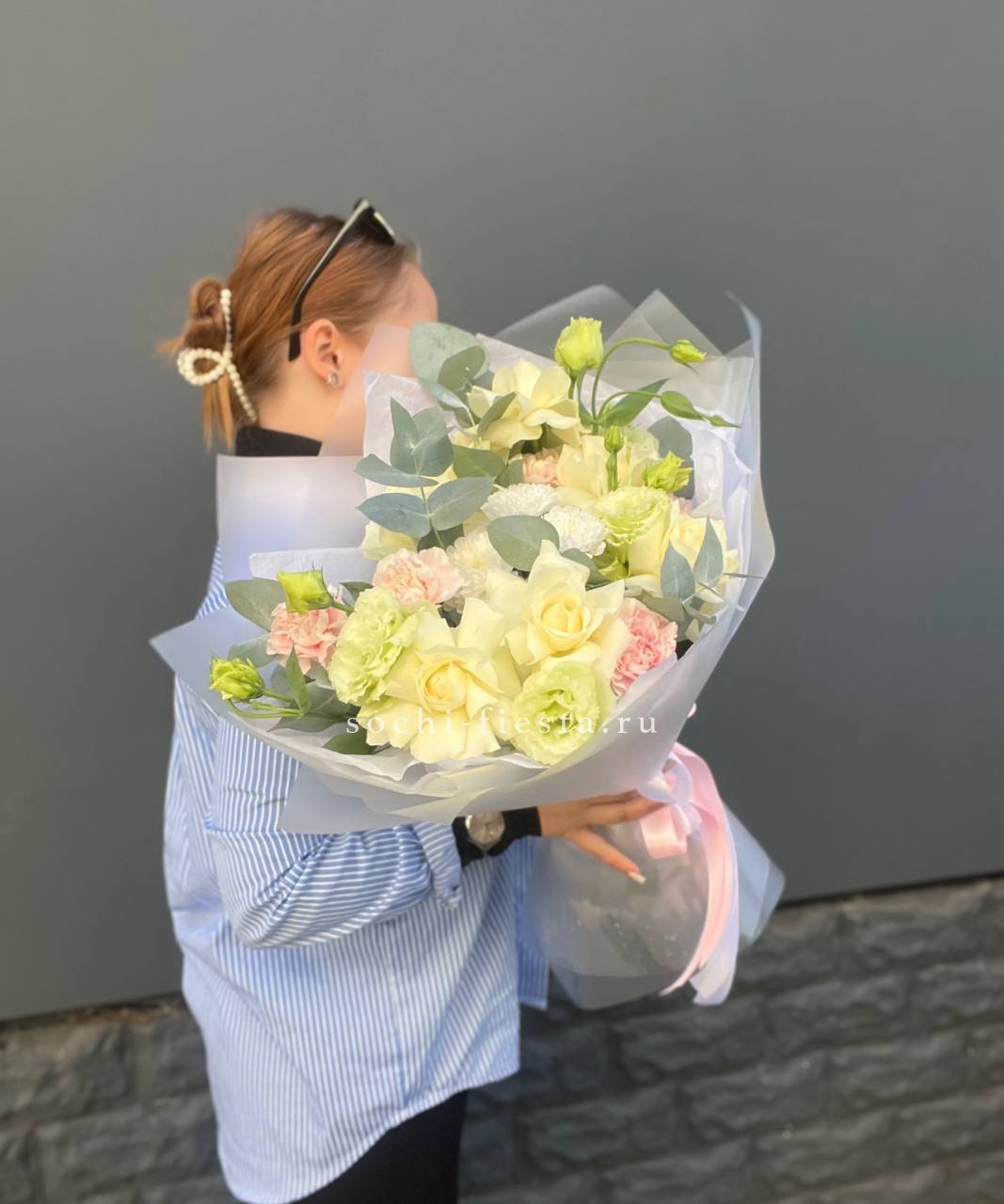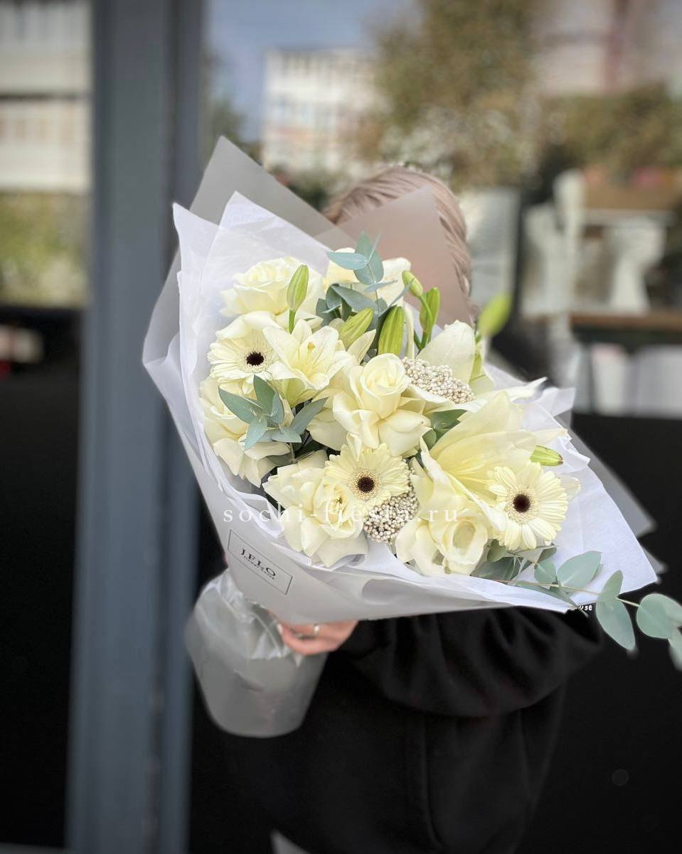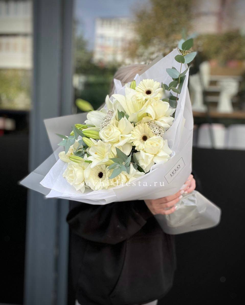 Состав: диантус, эустома, хризантема, белая роза, эвкалипт, упаковка