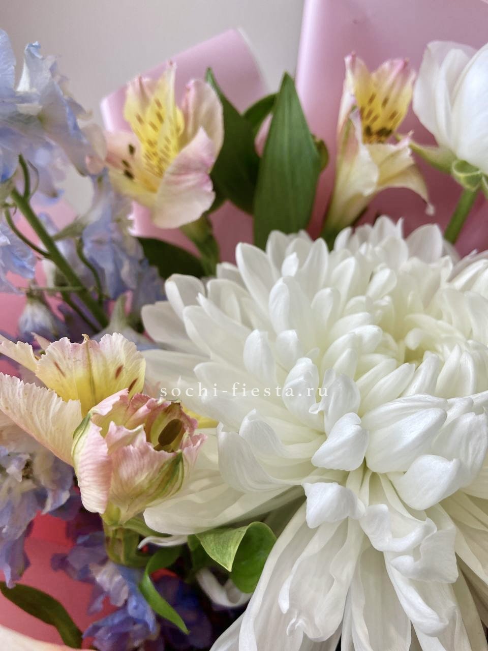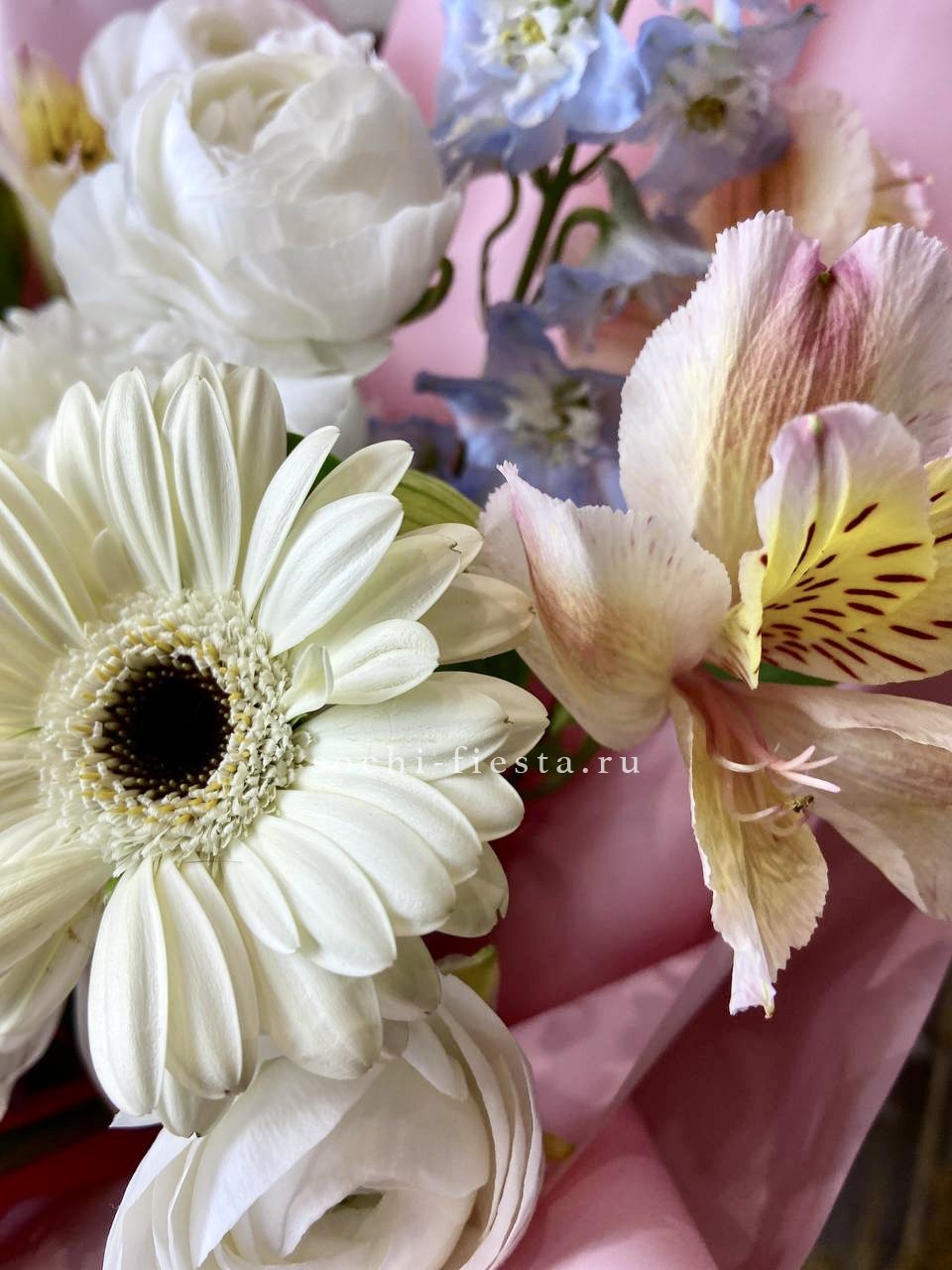 Состав: ранункулюс, гербера, альстромерия, хризантема, дельфиниум, авторское оформление