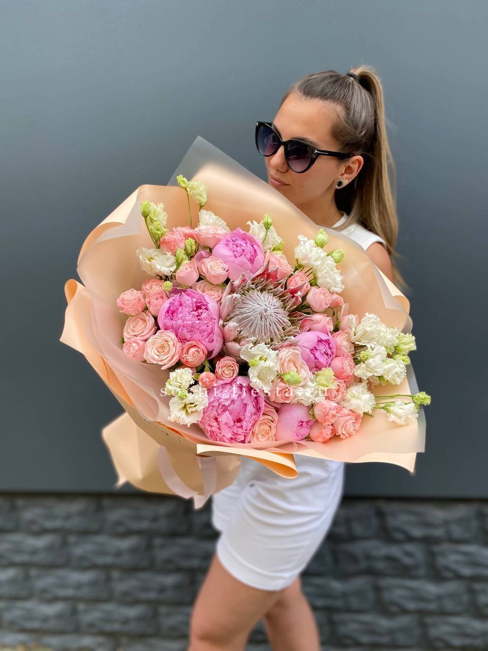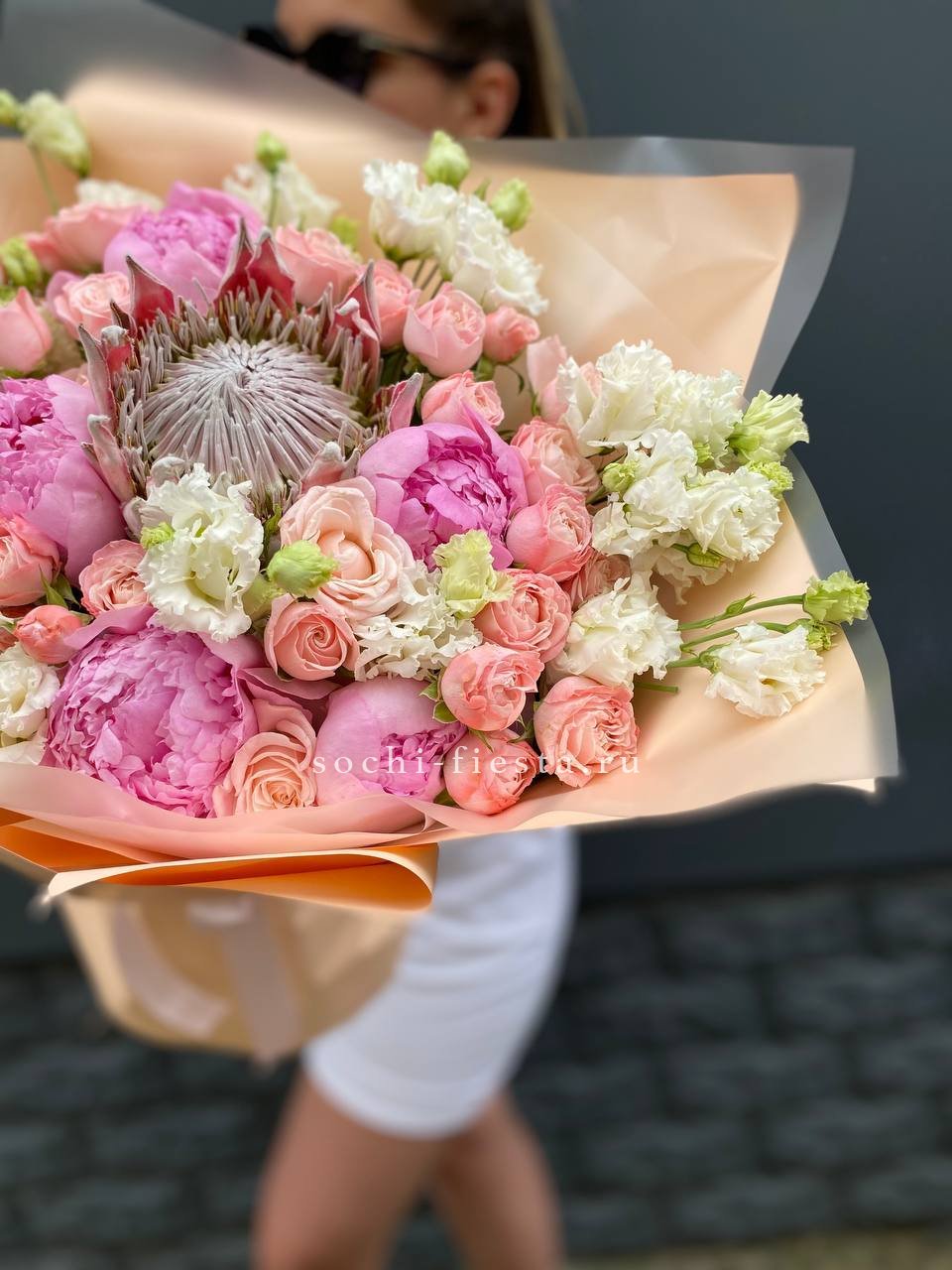 Состав:  эустомы, пионы, кустовые розы, протея, лента, авторское оформление.