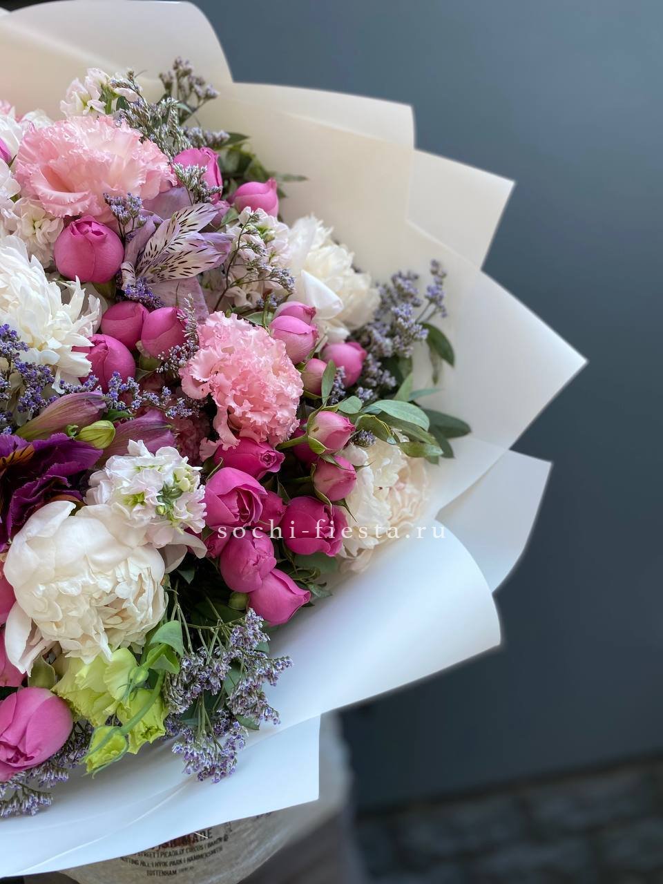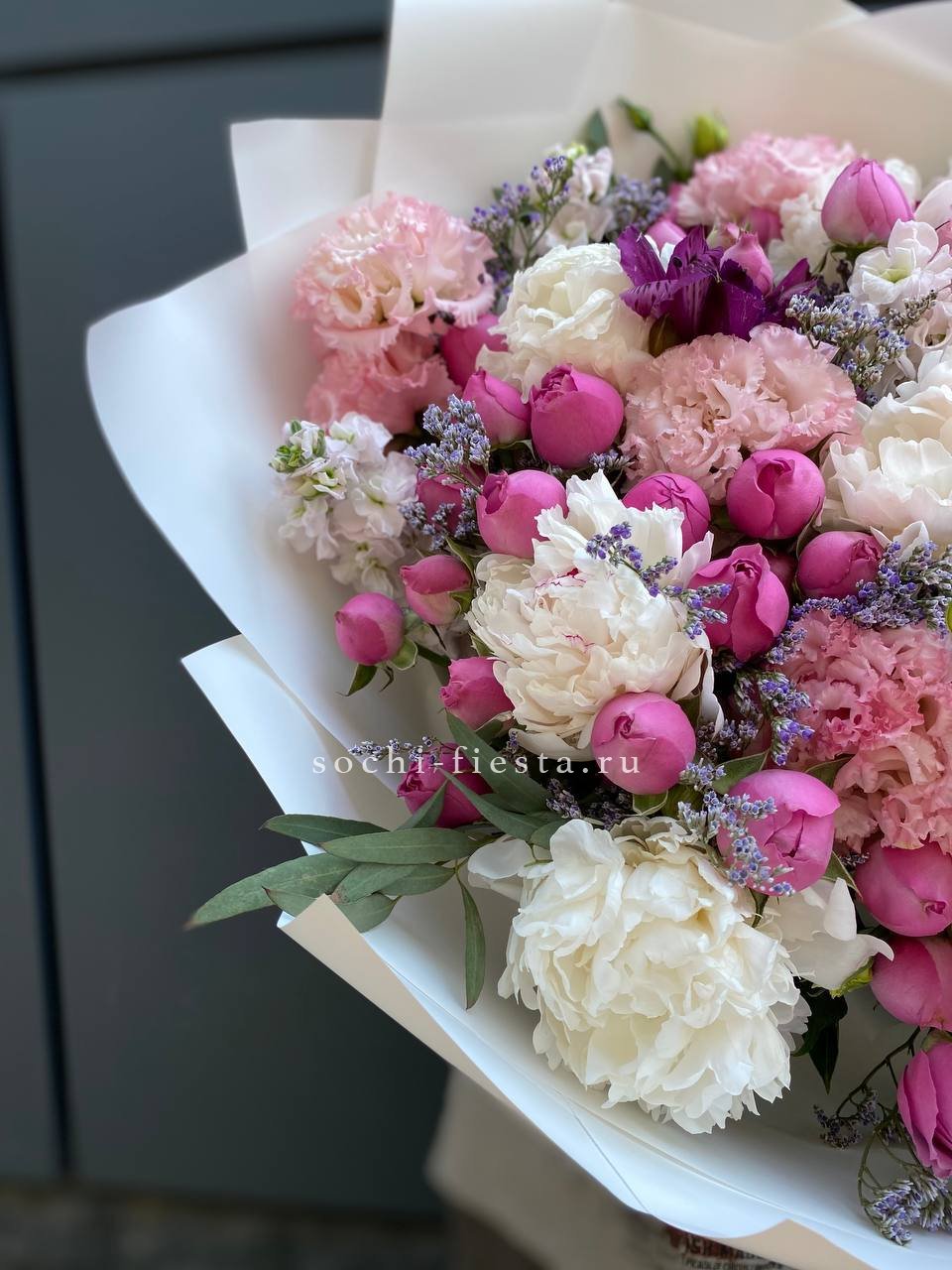 Состав: пионы (или аналог вне сезона), лимониум, маттиола, мисти баблс, эустома, эвкалипт, лента, упаковка
