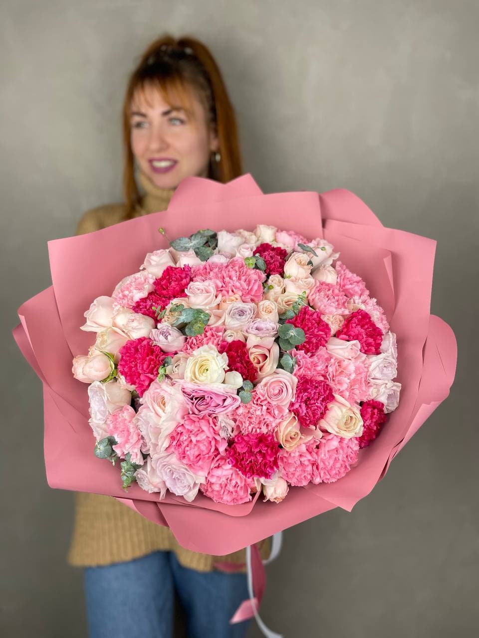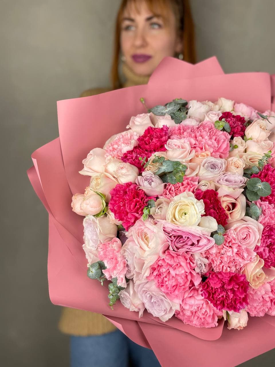 Состав: розы, пионовидные кустовые розы, диантусы, эвкалипт, лента, дизайнерская упаковка