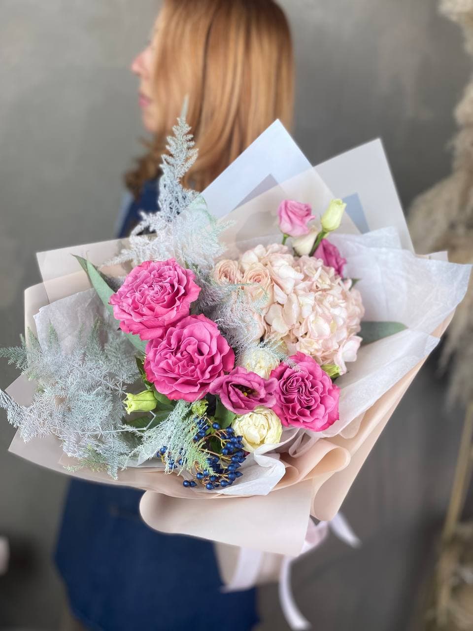 Состав: гортензия, пионовидная роза, эустома, аспарагус (или аналог), лента, дизайнерская упаковка