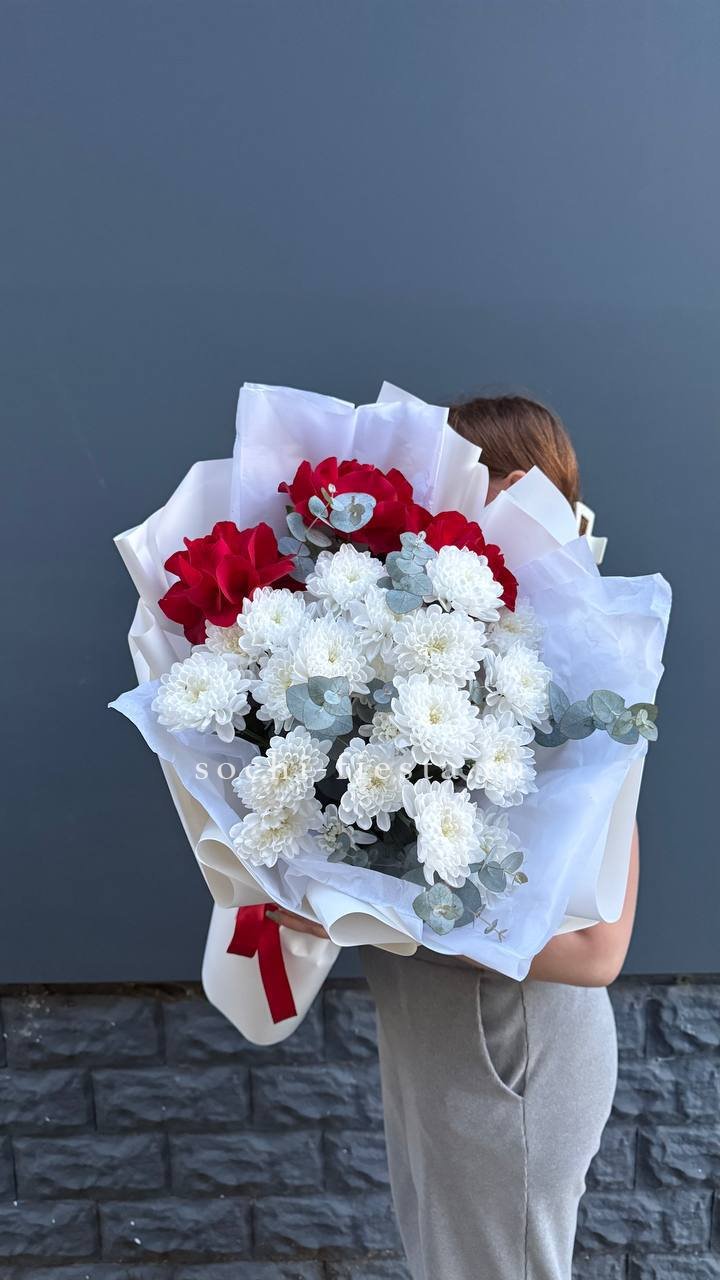 Состав: хризантема кустовая, красные розы с эвкалиптом в воздушном оформлении