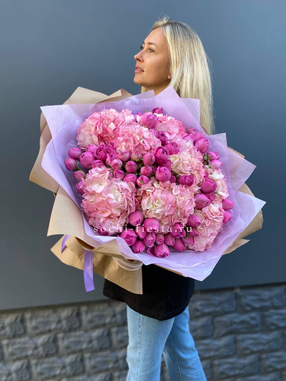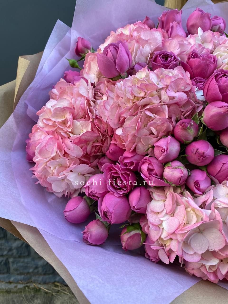 Состав: гортензия, пионовидная кустовая роза Мисти Баблс, лента, дизайнерская упаковка