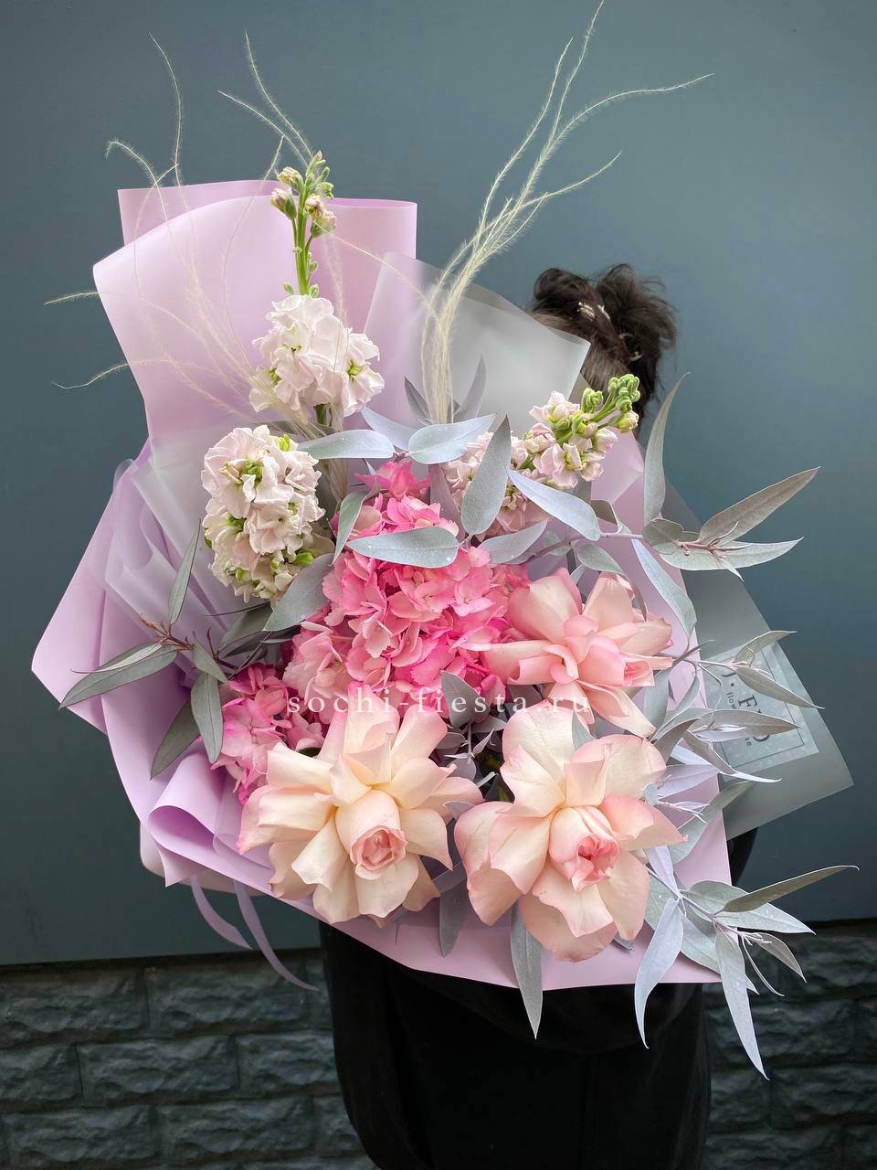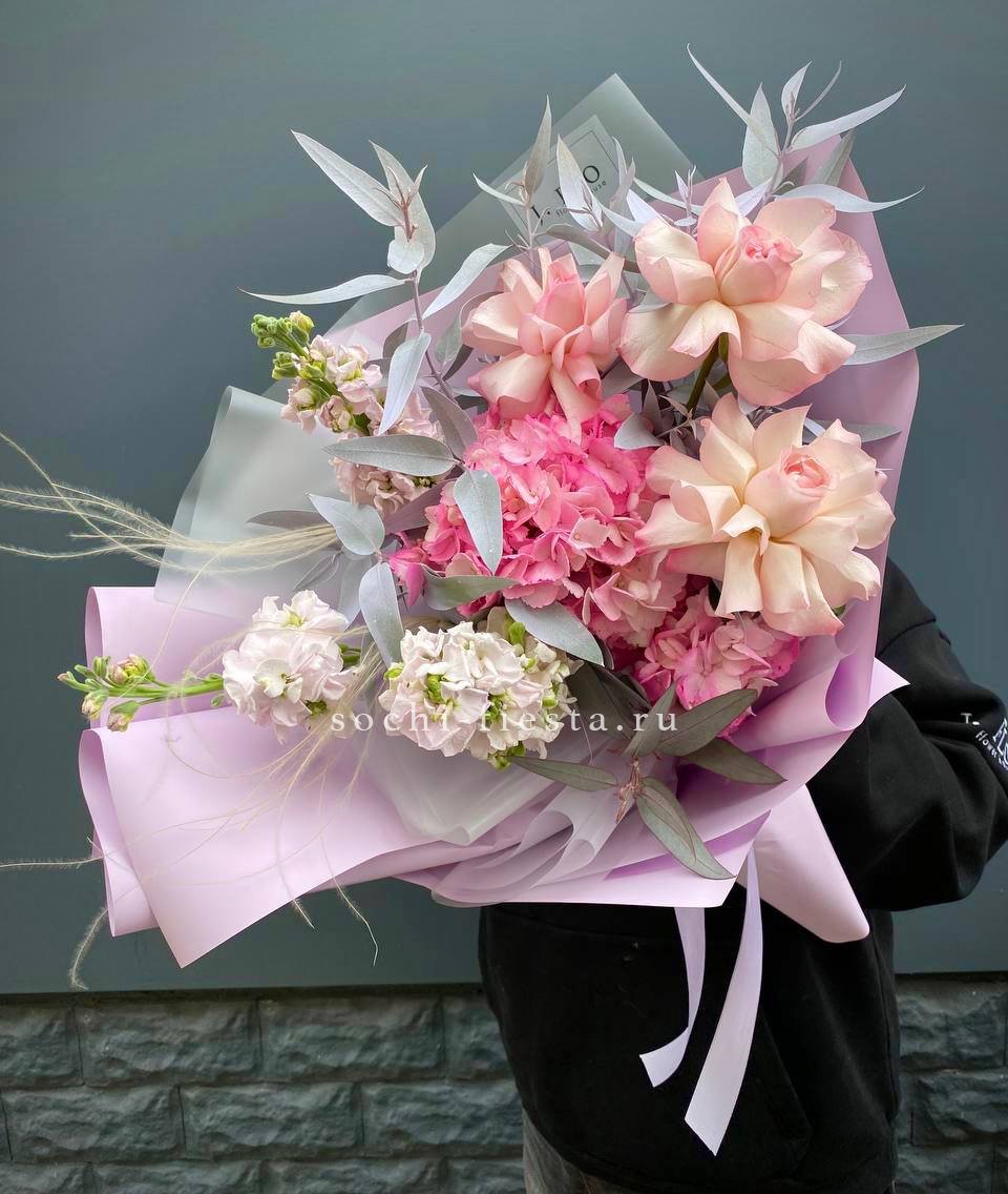 Состав: розы одноголовые, пион (или диантус), маттиола, эвкалипт, декоративная зелень, лента, дизайнерская пленка
