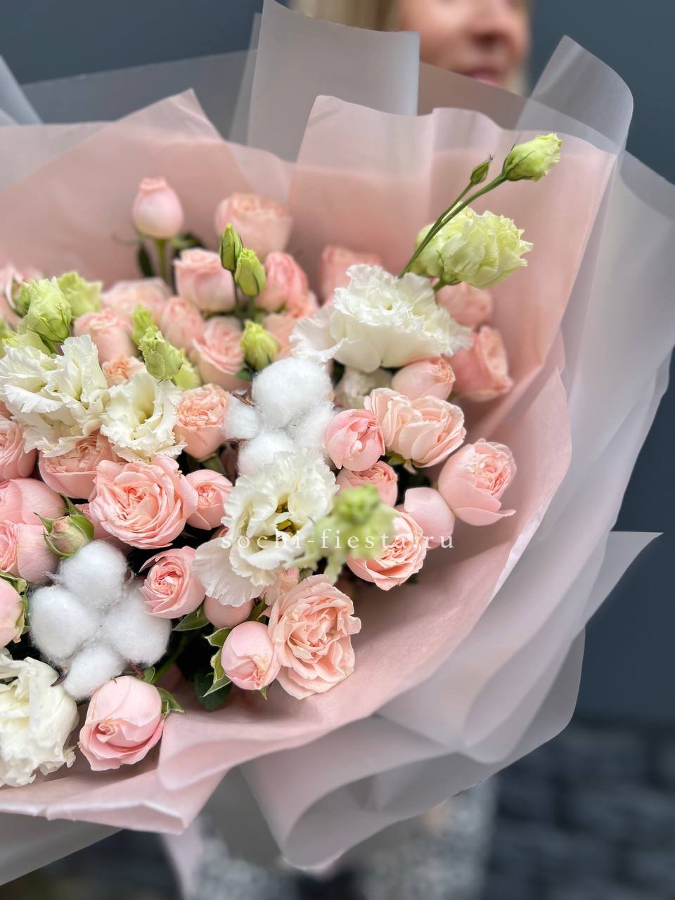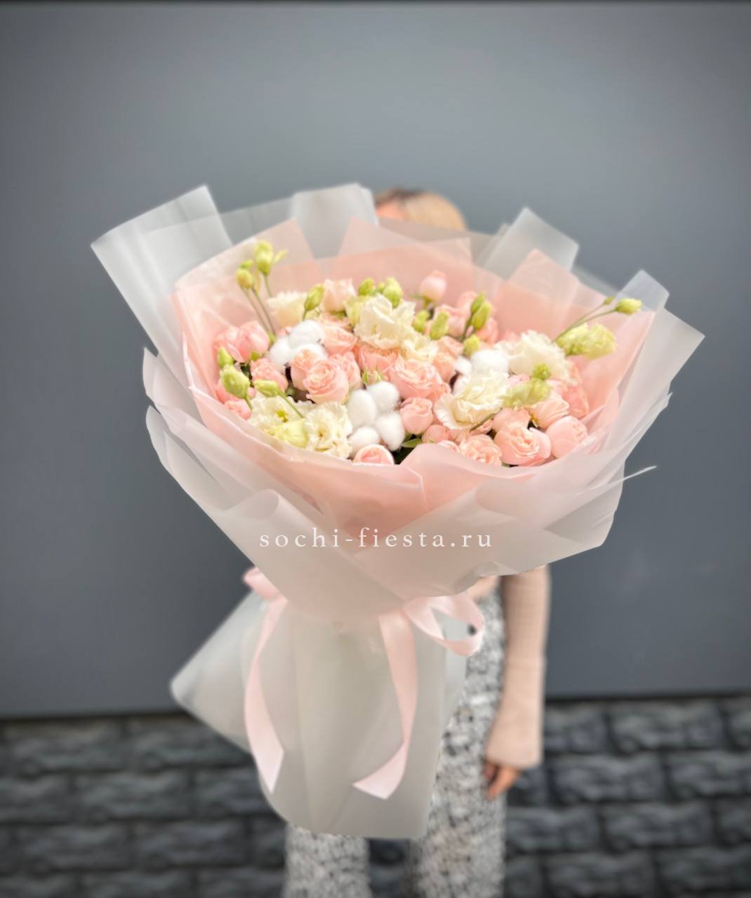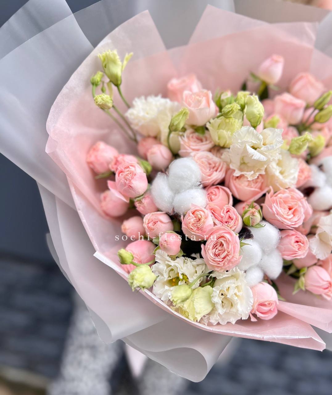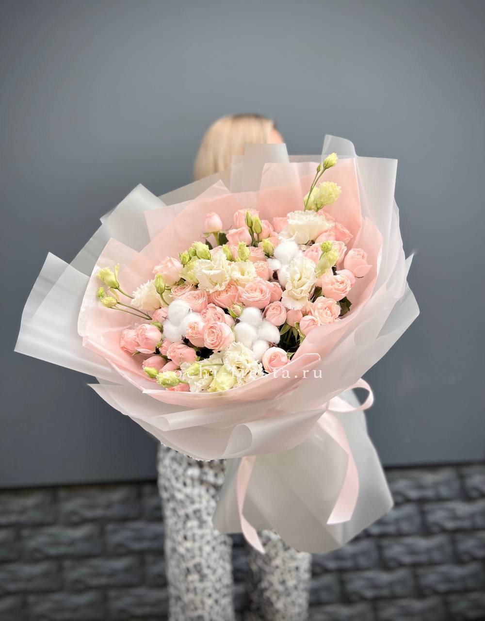Авторский букет в составе которого:  кустовые розы, эустома, хлопок, лента и дизайнерская пленка.